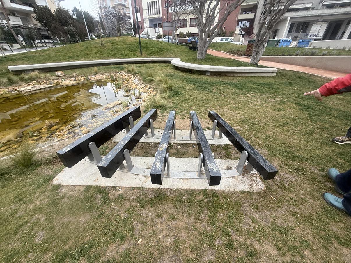 Σε άλλο σημείο του πάρκου, σε ένα φυσικό μουσικό όργανο φτιαγμένο από μάρμαρο αφαίρεσαν τα πακτωμένα κύμβαλα που η χρήση τους δημιουργούσε πάνω στο μάρμαρο ήχους, αχρηστεύοντας στην πραγματικότητα το φυσικό εργαλείο ήχου.