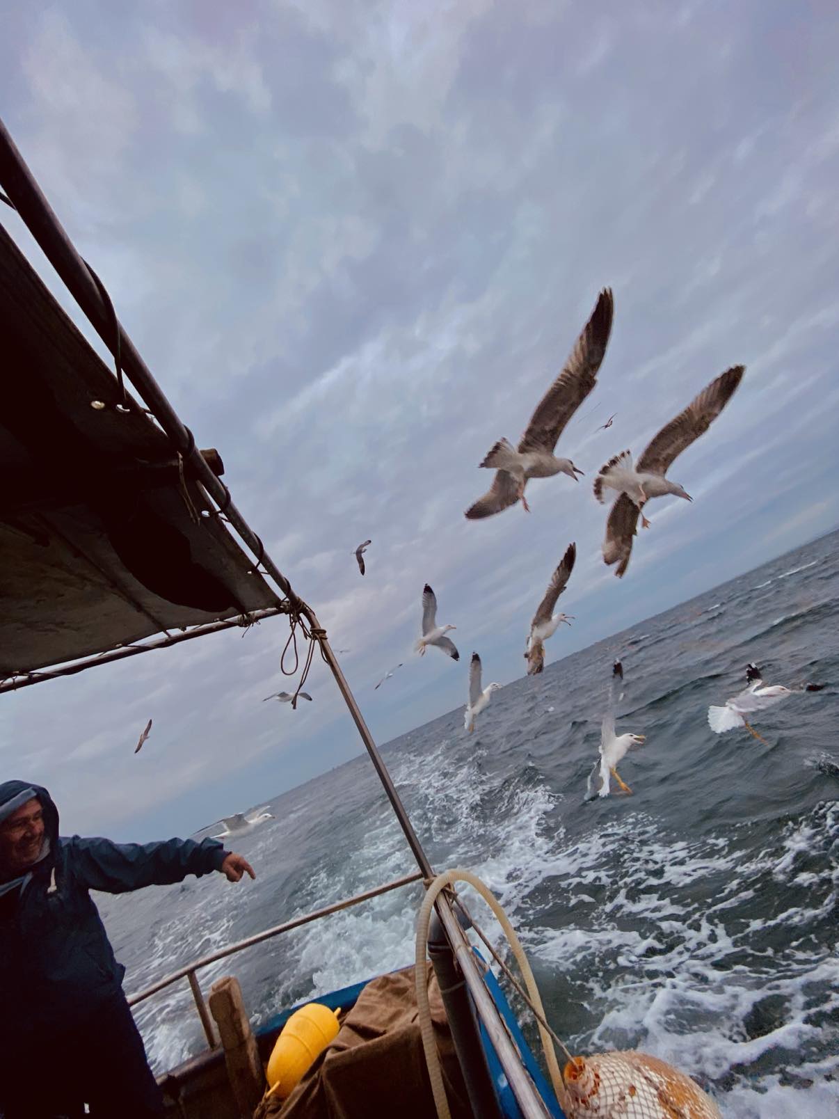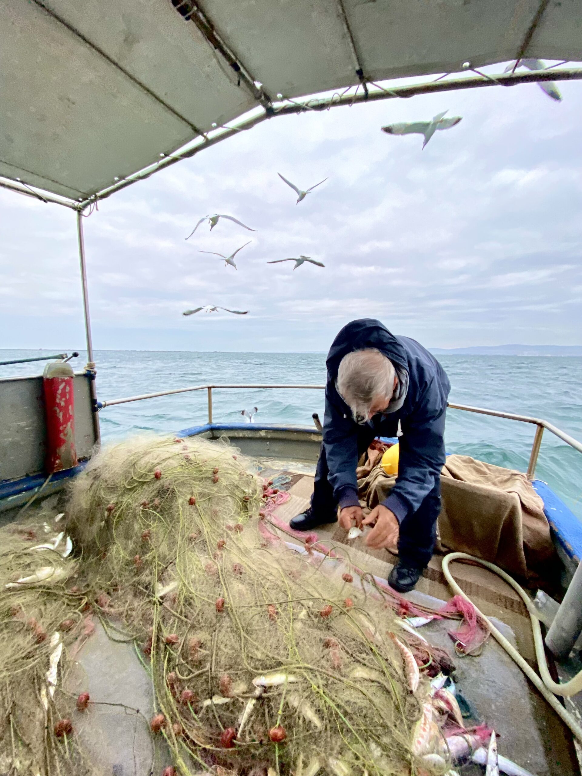 Και καθώς οι διηγήσεις μπλέκονταν με μαθήματα ζωής για όσα η θάλασσα του έμαθε τα κύματα φούντωναν και το κρύο περόνιαζε το σώμα, το πρωινό φως μεταμόρφωνε τα νερά από σκούρα σε γαλανά και τα ψάρια χοροπηδούσαν στα δίχτυα που απλώθηκαν και η αλμύρα στα φρύδια ήταν το αναμνηστικό που θα παίρναμε μαζί μας γυρνώντας μαζί με τις σπάνιες εικόνες της όψης της πόλης που σπάνια βλέπουμε και τους γλάρους που μας συνόδευσαν στο πήγαινε και στο έλα…