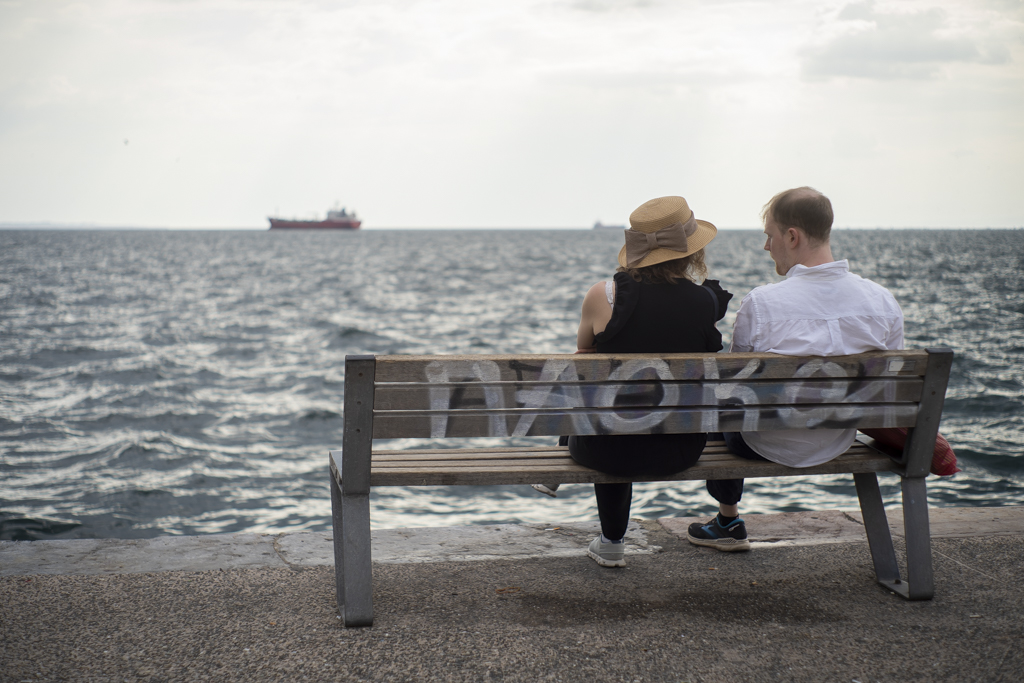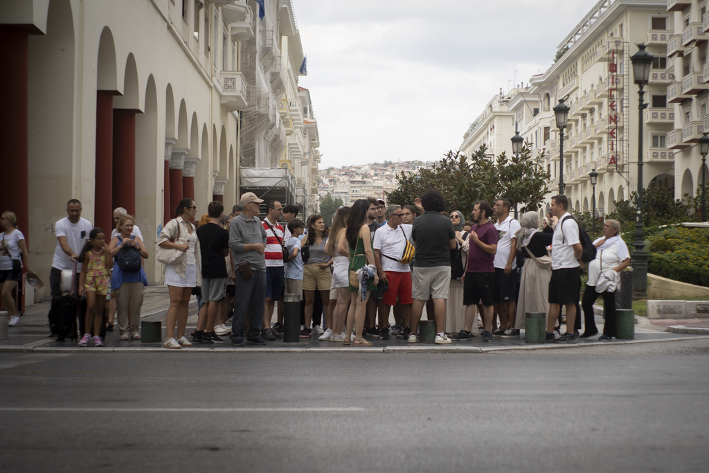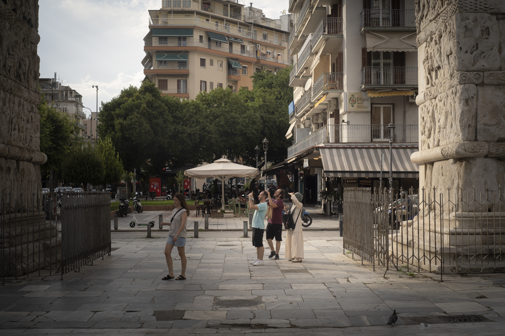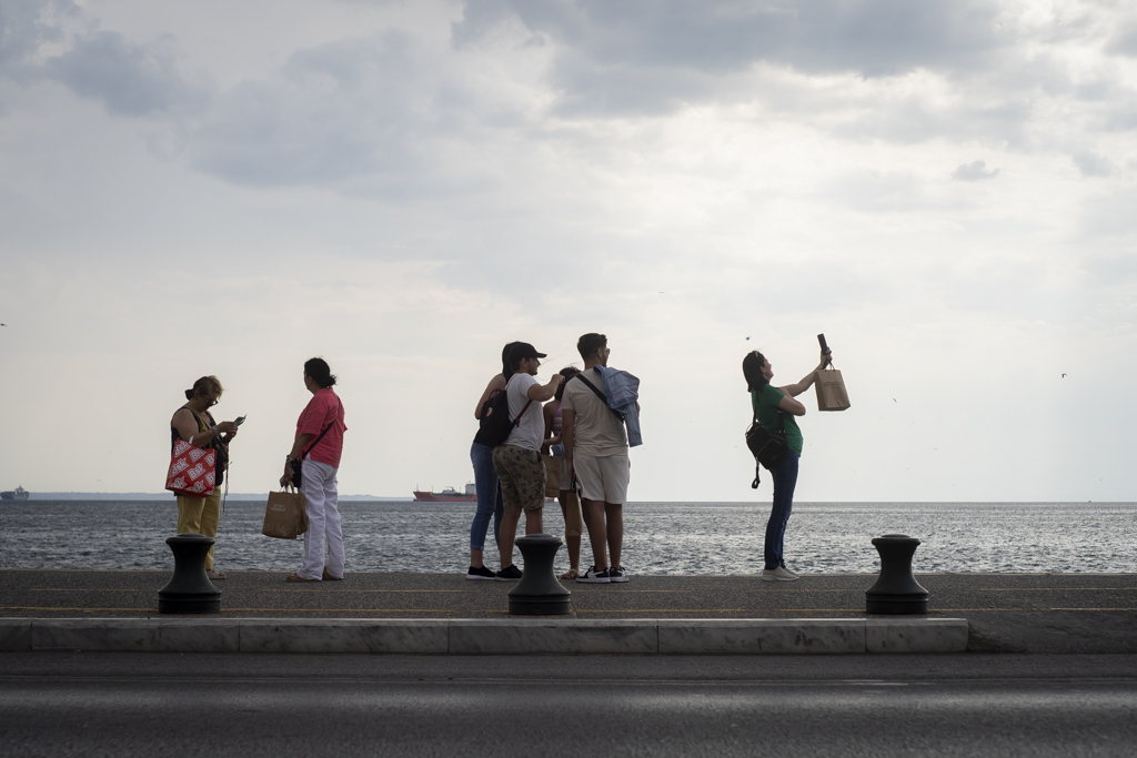 Τουρίστες βγάζουν με τα κινητά τους φωτογραφίες τα αξιοθέατα της πόλης. Παρέες γευματίζουν σε ταβέρνες, ενώ ζευγάρια αγναντεύουν το Θερμαϊκό από τα παγκάκια στην παραλιακή, κάτω από το συννεφιασμένο ουρανό.