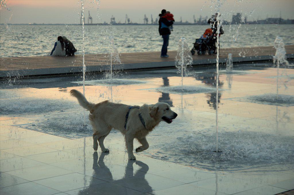 Δίπλα στις ομπρέλες του Ζογγολόπουλου, ήρθε να προστεθεί το τρίτο στοιχείο της υδάτινης αίσθησης. Ο Ζογγολόπουλος έχει σαν kεντρικό στοιχείο στα γλυπτά του το νερό. Ίσως γι΄αυτό και η τοποθέτηση τους στη Νέα Παραλία είναι ιδανική επιλογή. Οι Ομπρέλες του στο πιο κεντρικό σημείο του νέου παραλιακού μετώπου βρήκαν την ιδανική τους θέση. Πίσω απλώνονται τα νερά του Θερμαϊκού που αλλάζουν χρώμα ανάλογα με τις διαθέσεις του καιρού και τις ώρες τη μέρας και δίπλα του ακριβώς οι πίδακες με το διάφανο νερό. Άλλο ένα όμορφο σημείο της Παραλίας στην τελική του μορφή.
