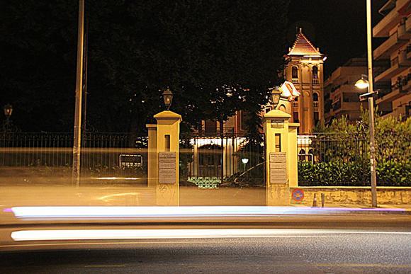 Ένα πανέμορφο κτίριο, στην δεξιά πλευρά του οποίου, καλά κρυμένο ανάμεσα στις πολυκατοικίες βρίσκεται ένα καταπράσινο παρκάκι. Στο κέντρο του ένα όμορφο συντριβάνι, με φόντο το βράδυ τον φωτισμένο Πύργο της Βίλας Καπαντζή.