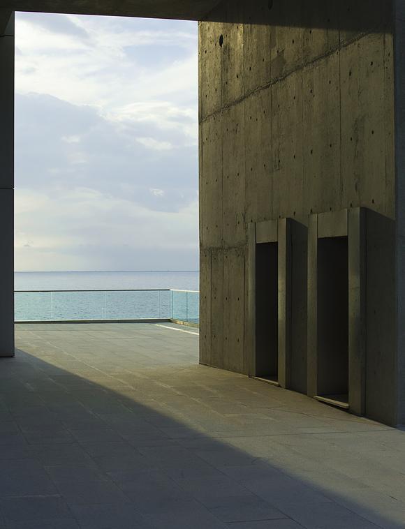 Η φωτογραφία αυτή είναι από το Μέγαρο Μουσικής – Κτίριο Μ2. Το τεράστιο αυτό κτίριο, παρουσιάζει ένα ιδιαίτερο αρχιτεκτονικό ενδιαφέρον, εξαιτίας της γειτνίασης του με τη θάλασσα. Είναι ένα ωραίο σημείο να περάσει κάποιος ένα ήσυχο απόγευμα. Ο αρχιτέκτονας Αράτα Ισοζάκι δημιούργησε ένα ωραίο “παιχνίδι” με τα ανοίγματα προς τη θάλασσα.