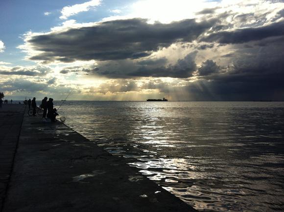 Αγαπημένη απογευματινή βόλτα στην παραλία. Στέκεσαι δίπλα στους ψαράδες που δοκιμάζουν την τύχη τους πλάι στο Μέγαρο Μουσικής. Ο ουρανός παίζει τα δικά του παιχνίδια και λούζει με το φως του τα πλοία του Θερμαϊκού. Δε νομίζω να πάψω να φωτογραφίζω την πόλη από το συγκεκριμένο σημείο.