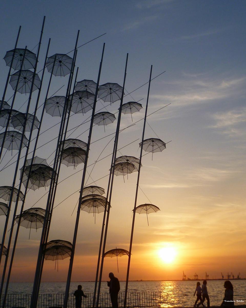 Από το εντυπωσιακό γλυπτό του Γιώργου Ζογγολόπουλου, απολαμβάνω το αδιαπραγμάτευτο σε ομορφιά ηλιοβασίλεμα της, ατενίζοντας τον Θρόνο του Δία, ακούγοντας τον απόηχο των οπλών του Βουκεφάλα να καλπάζει διασχίζοντας την Αρχαία Γη. Οι άχαροι, στο φως της ημέρας γερανοί της τελευταίας προβλήτας, τυλίγονται στο χρώμα της πορφύρας. Μοιάζουν με τρίαινες του Ποσειδώνα, που στέκουν στην άκρη του λιμανιού, σαν παρατεταγμένοι φύλακες της Πόλης.