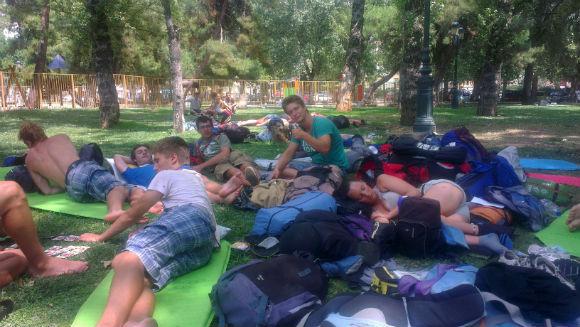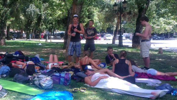 Στα γρασίδια της Πλατείας Δικαστηρίων είχαν αράξει και απλωθεί περί τα 25 νέα παιδιά, κορίτσια κι αγόρια μαζί με τα μπαγάζια τους. Τους πλησίασα, κάποιοι κοιμόντουσαν και κάποιοι άλλοι απλά ξεκουράζονταν, μερικοί παίζανε χαρτιά. Πιάσαμε κουβέντα. Έτσι έμαθα πως είναι Βαλλώνοι από το Βέλγιο, από μια μικρή πόλη 30 χιλιόμετρα από τις Βρυξέλλες και βρίσκονταν στη Σαλονίκη για να πάρουν το τρένο της επιστροφής για το Βέλγιο μέσω Σερβίας.