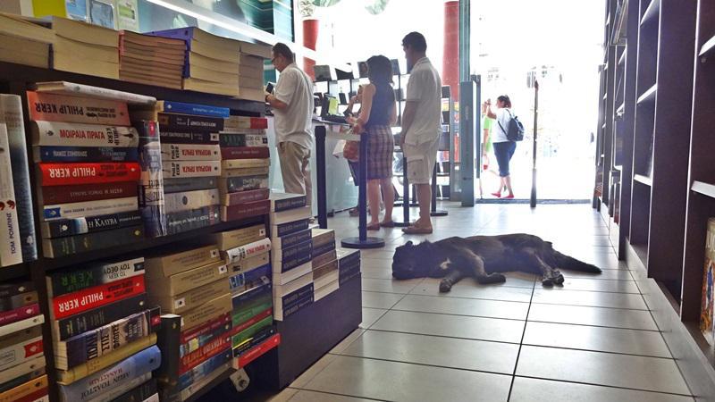 Σε γνωστό βιβλιοπωλείο της πόλης οι πόρτες είναι ανοικτές για όλους. Και για τους τετράποδους αδέσποτους φίλους μας που υποφέρουν ιδιαίτερα εν μέσω καύσωνα.