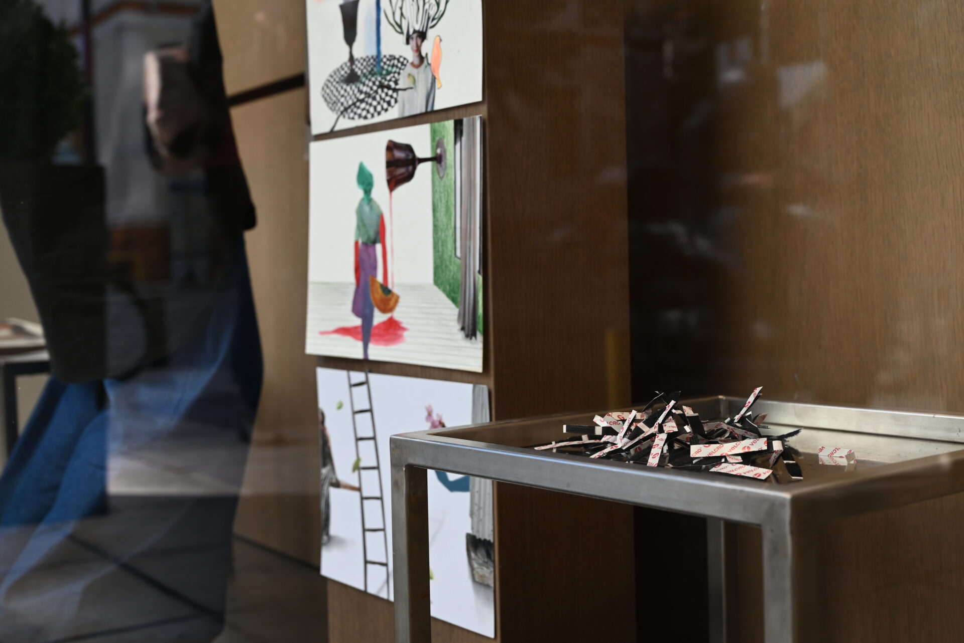 Περίπου 100 έργα μικρών διαστάσεων, με αφετηρία το ένδυμα, μεταποιούνται σε υπερρεαλιστικά σύμπαντα, άβολα κατά το πλείστον, ταυτόχρονα και τρομερά αναπαυτικά για τη δική τους διαστροφή.