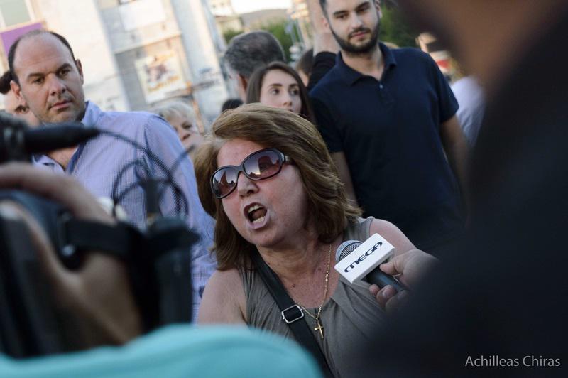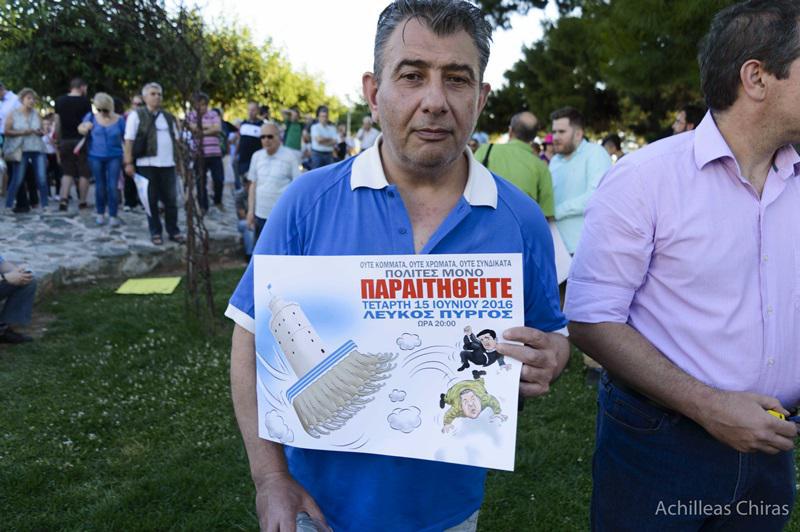 Οι πολίτες που συγκεντρώθηκαν ήταν ως επί το πλείστον μεγάλων ηλικιών και κανένα πολιτικό χρώμα δεν έβαψε την συγκέντρωση ούτε στα συνθήματα που ακούγονταν από τη μικροφωνική εγκατάσταση ούτε στα αυτοσχέδια πλακάτ. Τα συνθήματα επικεντρώθηκαν στην “Κόκκινη κάρτα” προς την Κυβέρνηση, ενώ παρών ήταν και ο το λιγότερο γραφικός Παναγιώτης Ψωμιάδης.