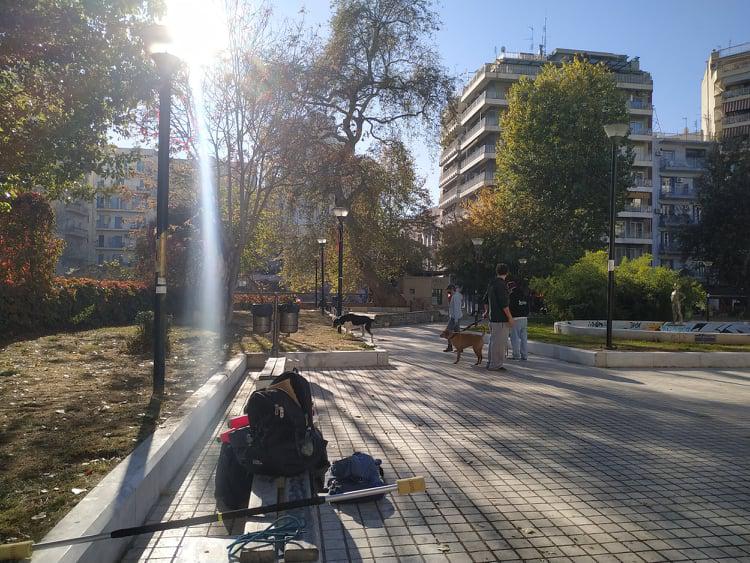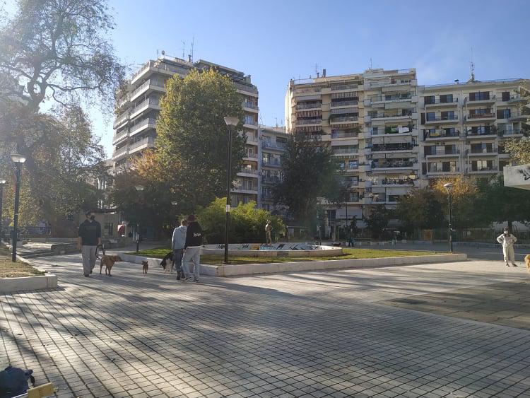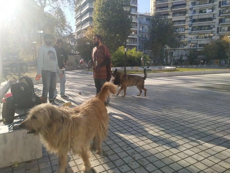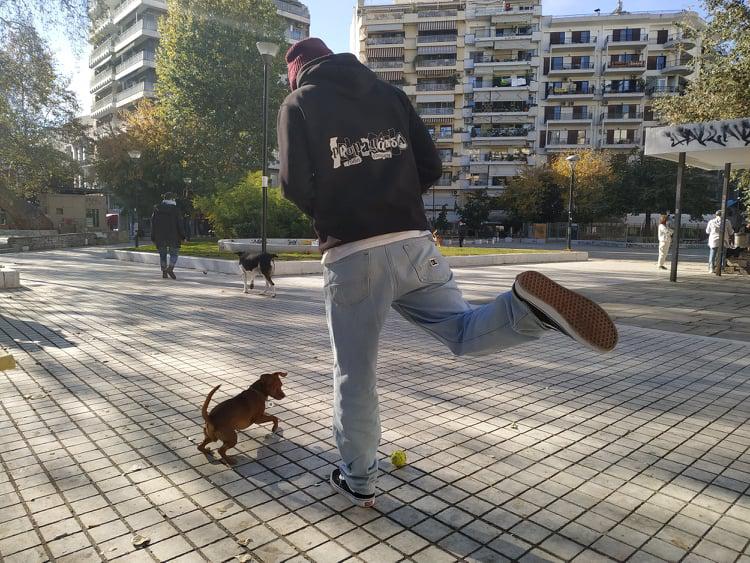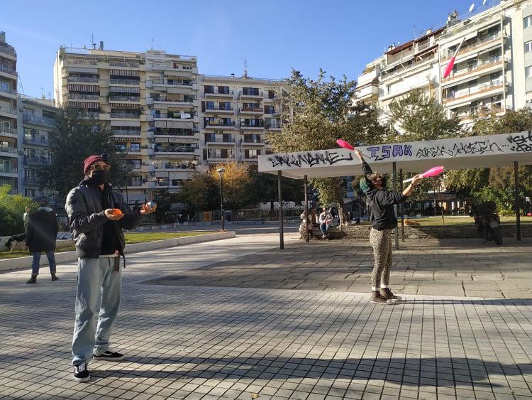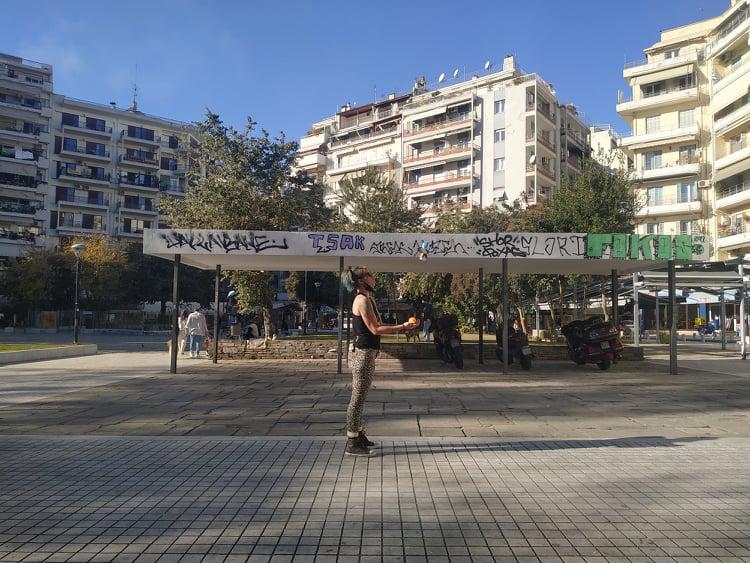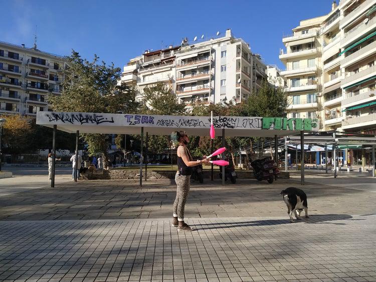 Όταν η πόλη μοιάζει έρημη, ένα ζευγάρι ζογκλέρ και ο σκύλος Βλάσης δίνουν ζωή στην άδεια πλατεία Ναβαρίνου.