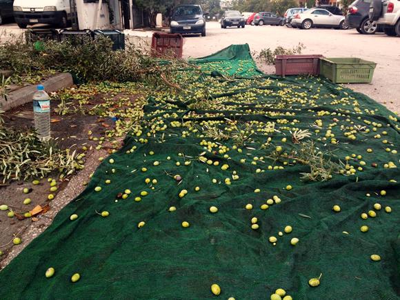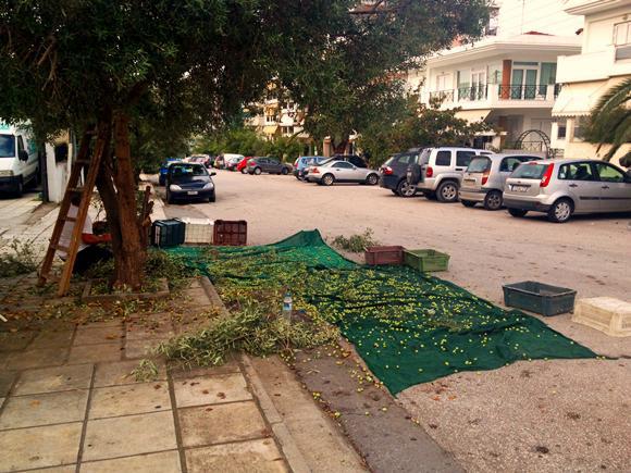 Μερικές φορές η πόλη, που νομίζεις ότι γνωρίζεις καλά, κρύβει εκπλήξεις. Ανάλογα με τις εποχές. Σήμερα το πρωί για παράδειγμα, το μάζεμα της ελιάς στα Κωνσταντινοπολίτικα, στην Άνω Τούμπα διατάραξε για λίγο την οπτική ομοιομορφία της καθημερινότητας. Πράσινο ύφασμα στρώθηκε στις πλάκες πεζοδρομίου, επιστρατεύτηκαν εργαλεία και καφάσια και γέμισε ο τόπος ευλογημένους καρπούς. Εικόνα εξοχής, γαλήνια, αρμονική του φθινοπώρου.
