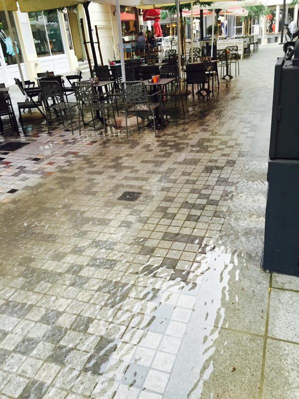 Σήμερα το πρωί καταστηματάρχες και κάτοικοι βρεθήκαμε μπροστά σε μια ακόμα έκπληξη πηγαίνοντας για τις δουλειές μας. Η ξαφνική καλοκαιρινή καταιγίδα είχε πλημμυρίσει όλο το δρόμο σε τέτοιο βαθμό που κόντεψε να μπει νερό σε όλα τα μαγαζιά και τις οικοδομές. Ο λόγος είναι ότι ενώ το έργο σχεδόν ολοκληρώθηκε όλα τα φρεάτια του δρόμου είναι βουλωμένα και πλημμυρισμένα μέχρι επάνω. Μια καταστηματάρχης της γειτονιάς ρώτησε κάποιον από τους υπεύθυνους του έργου που βρισκόταν στο σημείο τι θα γίνει με το θέμα των φρεατίων για να πάρει την “πληρωμένη” απάντηση “Έπρεπε να μας πείτε ότι είναι βουλωμένα να το ξέρουμε”.