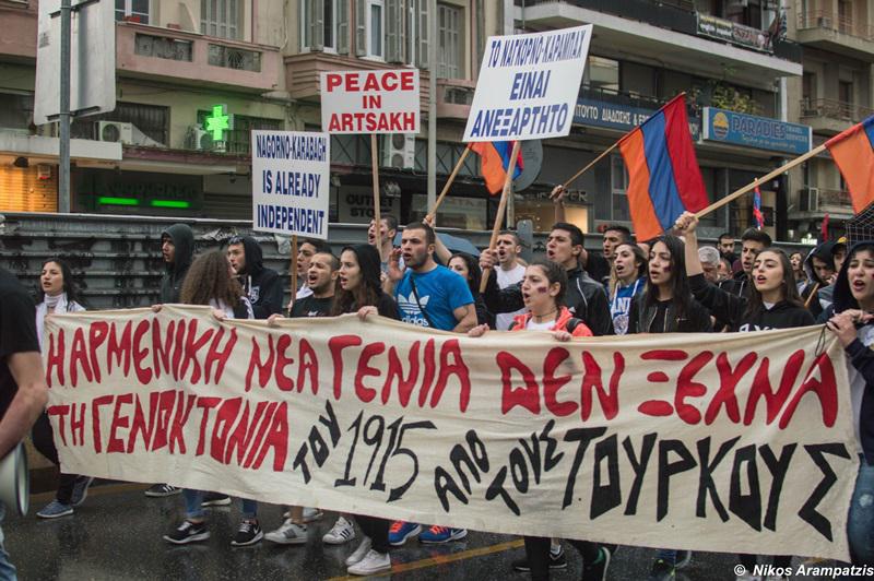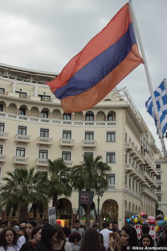 Το Σάββατο στις 23 Απριλίου, πραγματοποιήθηκε μια “θερμή” πορεία μνήμης 200 περίπου Αρμενίων της Θεσσαλονίκης για την γενοκτονία που εδώ και χρόνια παραμένει μετέωρη για πολλά κράτη, και φυσικά για την υπεύθυνη Τουρκία, δικδικώντας ιστορική αναγνώριση. Αυτή ήταν η 101η επέτειος της Γενοκτονίας των Αρμενίων και η πορεία μνήμης που διέσχισε το κέντρο της πόλης κατέληξε στο τουρκικό προξενείο, μέσω της Ιασωνίδου, όπου είχαν παραταχθεί τα ΜΑΤ εμποδίζοντας την προσέγγιση στο Προξενείο. Πορεία έγινε και στην Αθήνα.