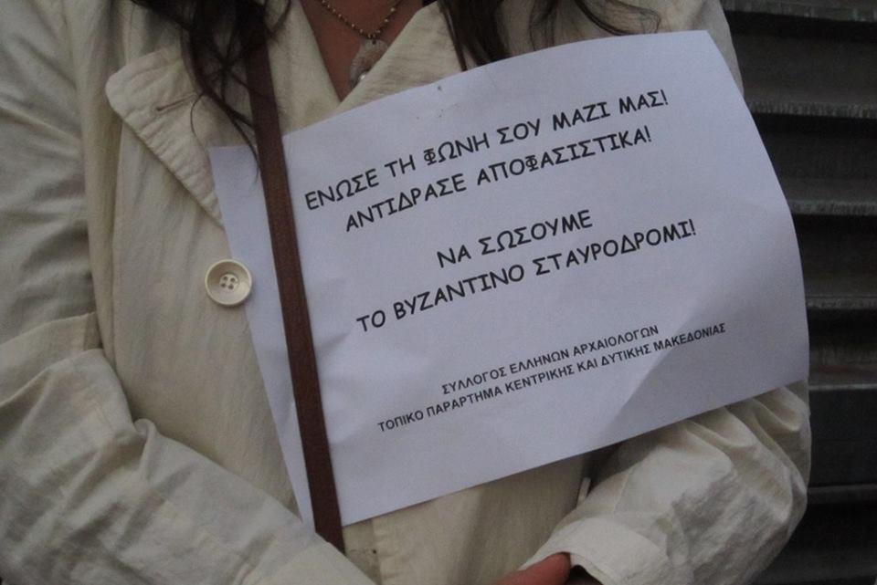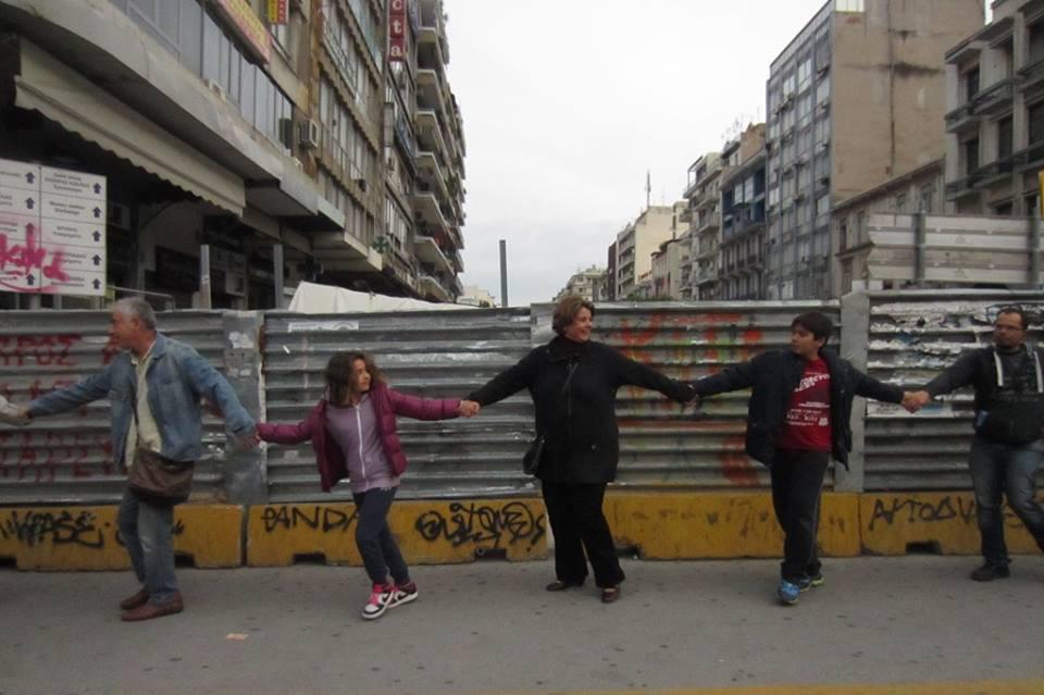 Ήμασταν λίγοι αλλά ήμασταν αποφασισμένοι. Μαζευτήκαμε στις έξι το απόγευμα στην πολύβουη Εγνατία. Μπροστά από τις αιώνιες λαμαρίνες του Μετρό, που χάσκουν εκεί και θα χάσκουν όπως φαίνεται για άγνωστο ακόμα αριθμό χρόνων, καθώς τα χρονοδιαγράμματα αποπεράτωσης αλλάζουν κάθε τόσο. Εκεί λοιπόν με οδηγό τα τύμπανα που ηχούσαν στα χέρια των μουσικών, περικυκλώσαμε για μισή ώρα το σημαντικότερο αρχαιολογικό εύρημα των τελευταίων χρόνων στην πόλη, τον αρχαίο αυτό δρόμο που η Αττικό Μετρό και οι πολιτικοί της προϊστάμενοι θέλουν τώρα να ξηλώσουν, χωρίς κάνεις να διασφαλίζει την επιστροφή του εκεί. Και ήταν τα περίεργα βλέμματα των περαστικών, διαβατών ή επιβατών σε αστικά και αυτοκίνητα, που έβλεπαν ένα τσούρμο τρελών στη μέση του μεγάλου δρόμου, να περικυκλώνουν με τα σώματα τους ένα σωρό από λαμαρίνες που με έκαναν να θέλω να φωνάξω για πρώτη φορά βγείτε και έλατε εδώ μαζί μας, κάτι σπουδαίο κρύβεται κάτω από αυτές τις λαμαρίνες. Και αυτό δεν είναι μόνο η Ιστορία μιας πόλης που πάει να ξεριζωθεί, μιας πόλης που έχει να καυχιέται μόνο για το παρελθόν της το μακραίωνο, είναι και η νοημοσύνη μας μαζί, που τη θεωρούν διαχειρίσιμη, έρμαιο στα χέρια ανάξιων ανθρώπων που κυβερνούν εδώ και δεκαετίες όχι με γνώμονα το κοινό καλό, το σεβασμό στον άνθρωπο, τις ανάγκες και τις ευαισθησίες του, αλλά με αποκλειστικό μέτρο τις εξυπηρετήσεις, τις διάπλοκες και το δικό τους όφελος.
