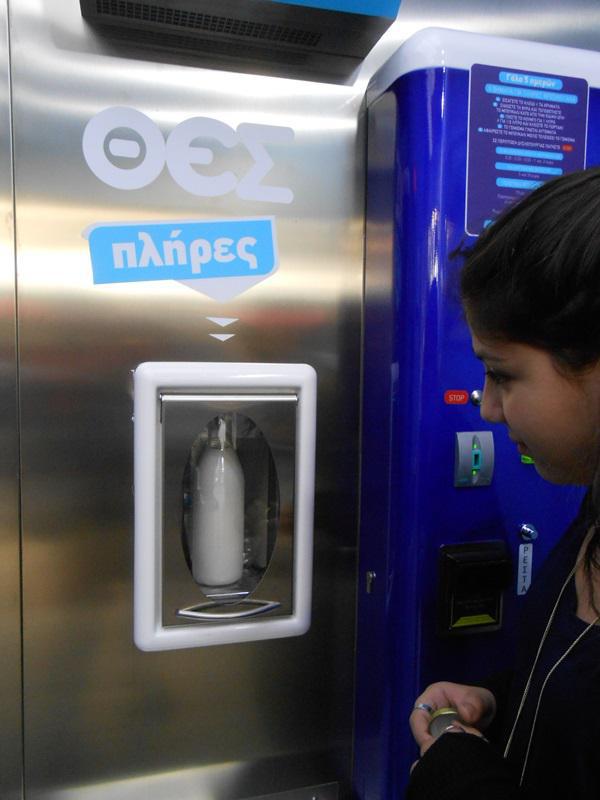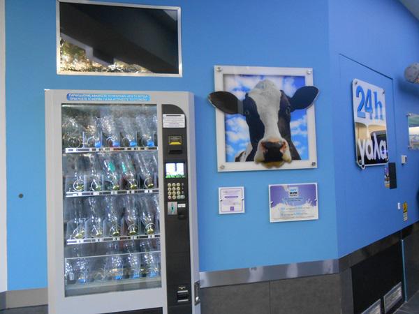 Πώς; Το γάλα είναι φρέσκο και μπορείς να επιλέξεις ανάμεσα σε φρέσκο και ελαφρύ. Το γάλα είναι συνεταιριστικό από φάρμες που καλύπτουν το 10% της εγχώριας παραγωγής (150 αγελαδοτρόφοι από τη Θεσσαλία και τη Μακεδονία και 55 φάρμες) και δίνουν γάλα και στις μεγάλες εταιρίες συσκευασίας. Διατίθεται στους πωλητές μέσα σε 24 ώρες από την παστερίωσή του και η διάρκειά του είναι 5 μέρες από τη στιγμή που γεμίζετε το μπουκάλι σας. Ξεκινάτε αγοράζοντας την συσκευασία. Πλαστική μιας χρήσης με 20 λεπτά και γυάλινη για να την επαναχρησιμοποιείτε όσες φορές θέλετε με 50 λεπτά. Εφ άπαξ μπορείτε να αγοράσετε μια φιάλη με 3 ευρώ που περιέχει ένα πράσινο κλειδάκι το οποίο χρησιμεύει σαν προπληρωμένη κάρτα. Βάζετε στο ειδικό μηχάνημα όσα χρήματα θέλετε για να την …γεμίσετε και την χρησιμοποιείτε μετά για να πάρετε το γάλα σας με έκπτωση 10 λεπτών (50 λεπτά αντί για 60 για το μισό λίτρο και 1 ευρώ αντί 1,10 για το ένα λίτρο. Υπάρχει επίσης δυνατότητα για τον καταναλωτή να χρησιμοποιήσει το δικό του μπουκάλι αρκεί να πληροί τις προϋποθέσεις μεγέθους και να τηρεί τους κανόνες υγιεινής. Προχωρείτε στο επόμενο μηχάνημα όπου εισάγετε τα χρήματα ή την προπληρωμένη κάρτα, σηκώνεται τη θύρα και τοποθετείτε το μπουκάλι κάτω απ΄το ειδικό στόμιο. Πατάτε το κουμπί αναλόγως αν θέλετε μισό ή ένα λίτρο και περιμένετε να γεμίσει το μπουκάλι σας με φρέσκο γάλα, πιστοποιημένο και ελεγμένο. Μόλις γεμίσει το μπουκάλι σας αυτόματα, το παίρνετε και αποχωρείτε. Από τις 11 Ιουνίου στους αυτόματους πωλητές μπουκαλιών στη Θεσσαλονίκη βρίσκεται και το γάλα κακάο ”θεςCHOCO” με τη σφραγίδα ποιότητας του Συνεταιρισμού ΘΕΣγάλα.Το «θεςCHOCO». πωλείται σε συσκευασία των 500 ml στην τιμή του ενός ευρώ.