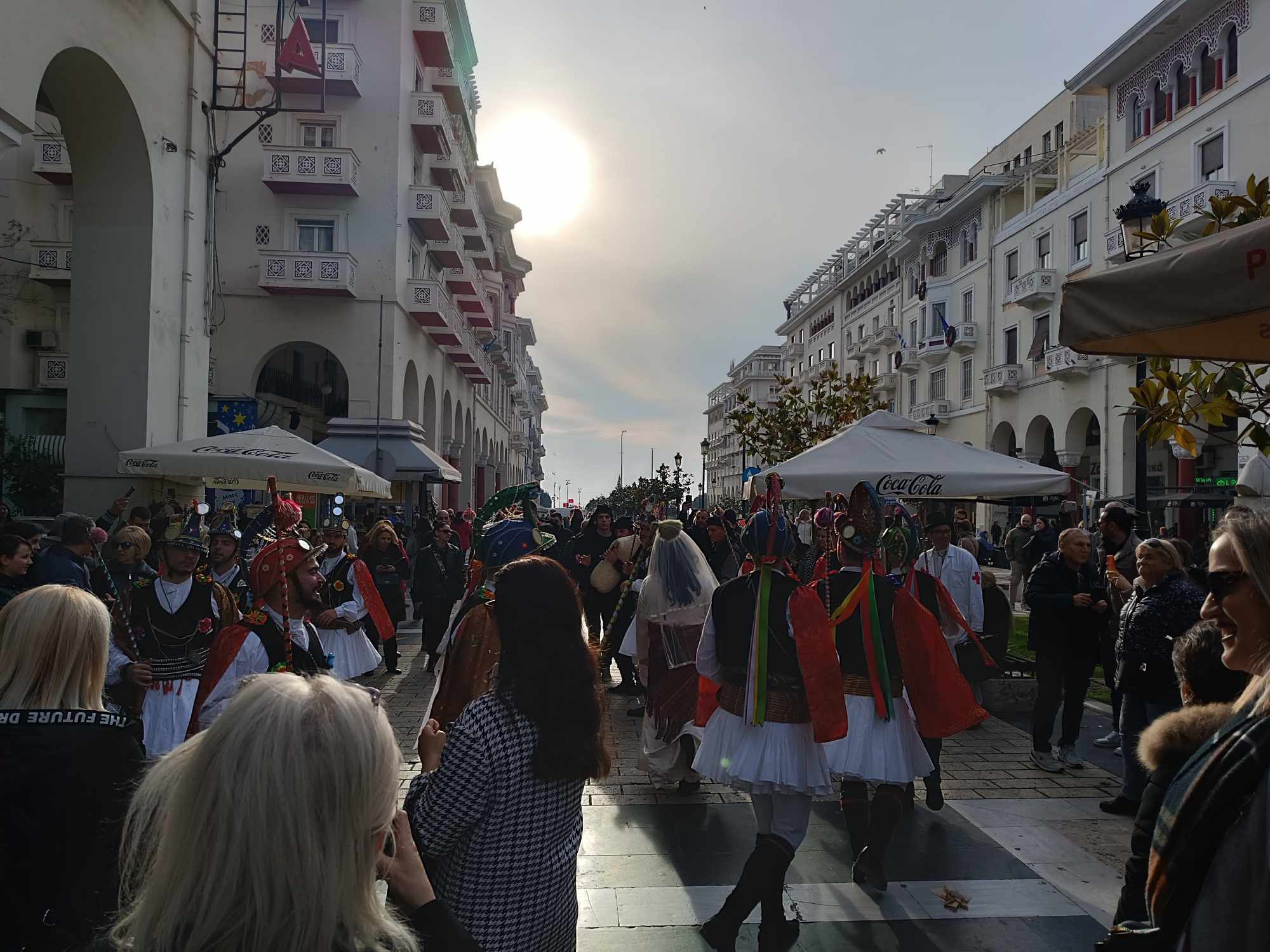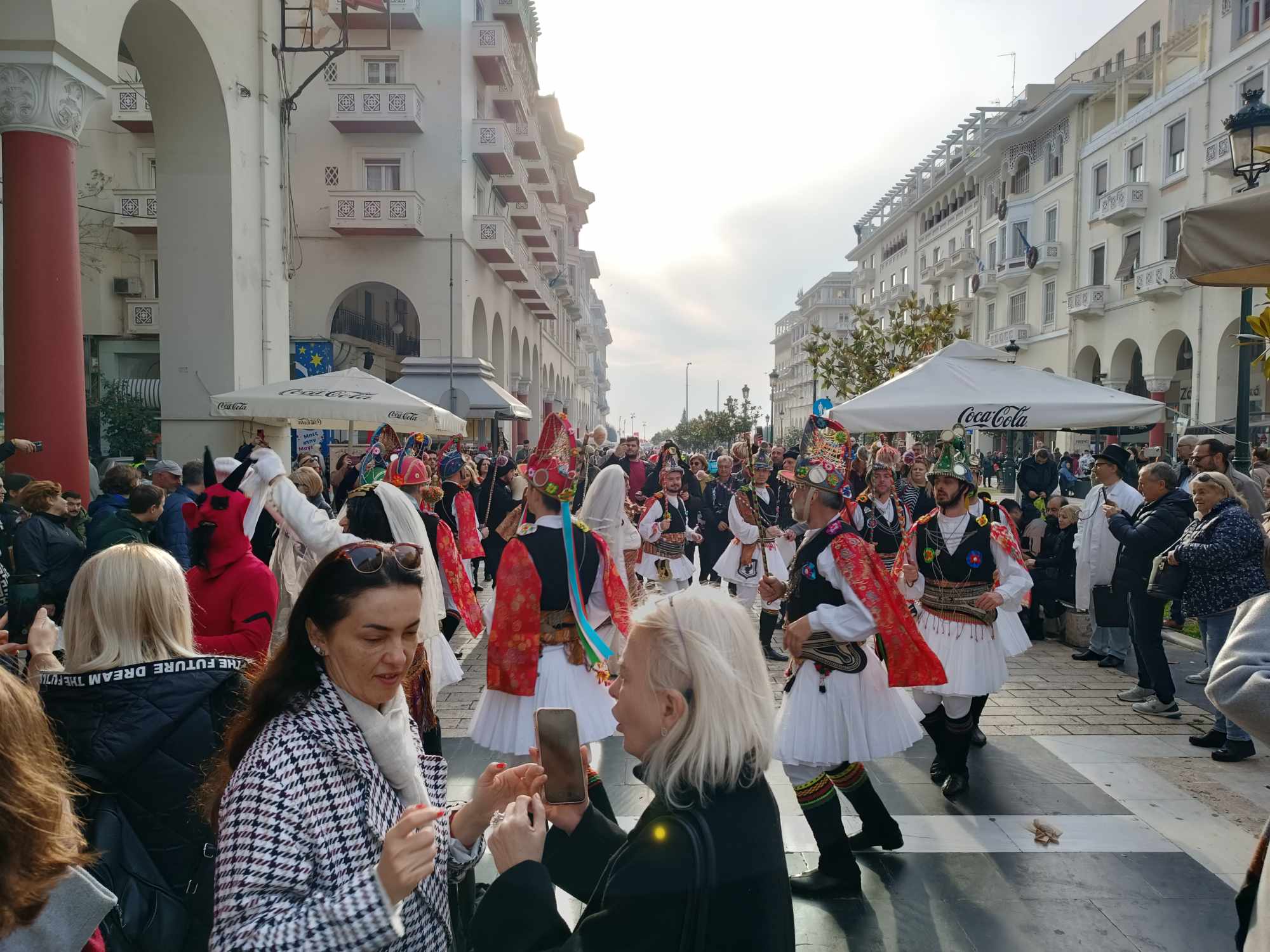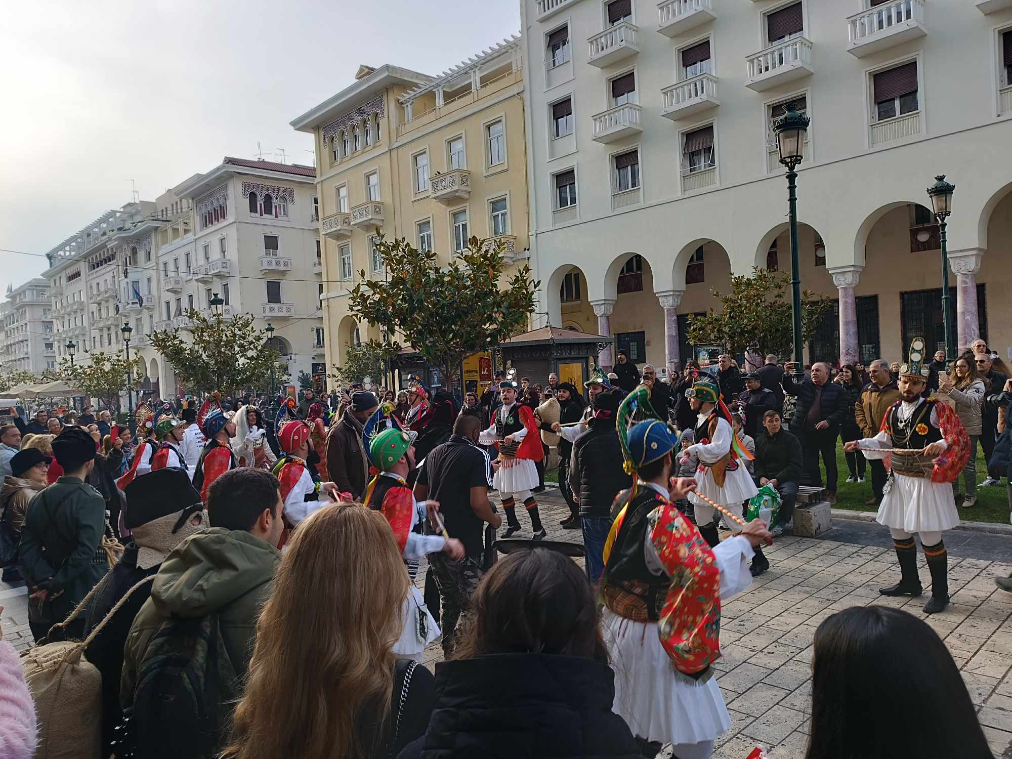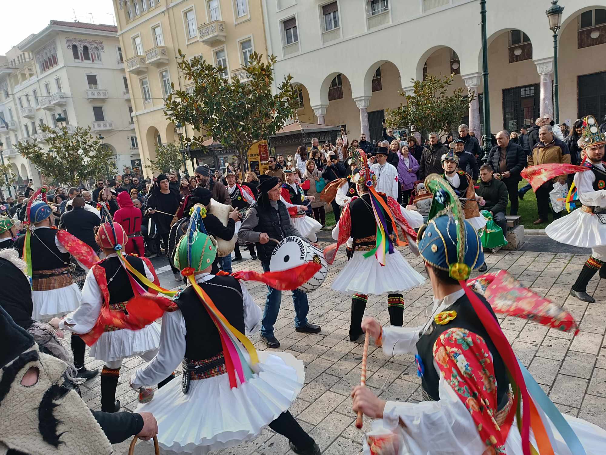 Μεγάλο γλέντι έχει στηθεί στην πλατεία Αριστοτέλους το μεσημέρι του Σαββάτου, με Μωμόγερους να παρασέρνουν τον κόσμο σε χορό!