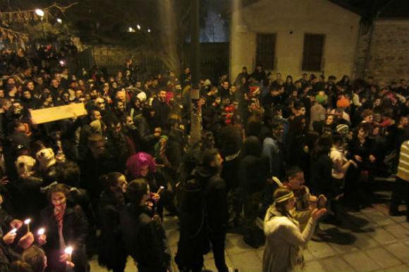 Κατά τύχη βρέθηκα φέτος στην πορεία του Zombie Riot και μπορώ να πω ότι εξεπλάγην ευχάριστα. Το σημείο συνάντησης ήταν στη Ροτόντα στις 9. Νέος κόσμος, γύρω στα 20, με αρκετή δόση χιούμορ και εκκεντρικές εμφανίσεις, βασισμένες κυρίως σε ταινίες splatter και b-movies γενικότερα. Οι περισσότερες από τις μεταμφιέσεις ήταν πετυχημένες τόσο εικαστικά όσο και ερμηνευτικά που ήταν δύσκολο να τις κοιτάς και να μη γελάς. Ο λοκατζής-ζόμπι, οι μπανταρισμένες νεκροζώντανες, νεκρές νύφες και αιμοσταγείς γαμπροί, η ματωμένη Χιονάτη είναι μόνο λίγες από τις τρομακτικές φυσιογνωμίες που τράβηξαν τα περισσότερα βλέμματα.