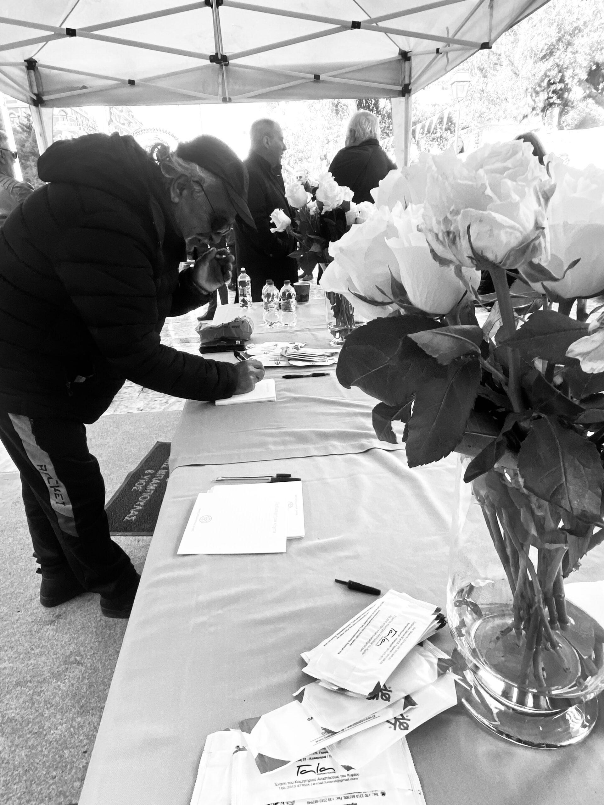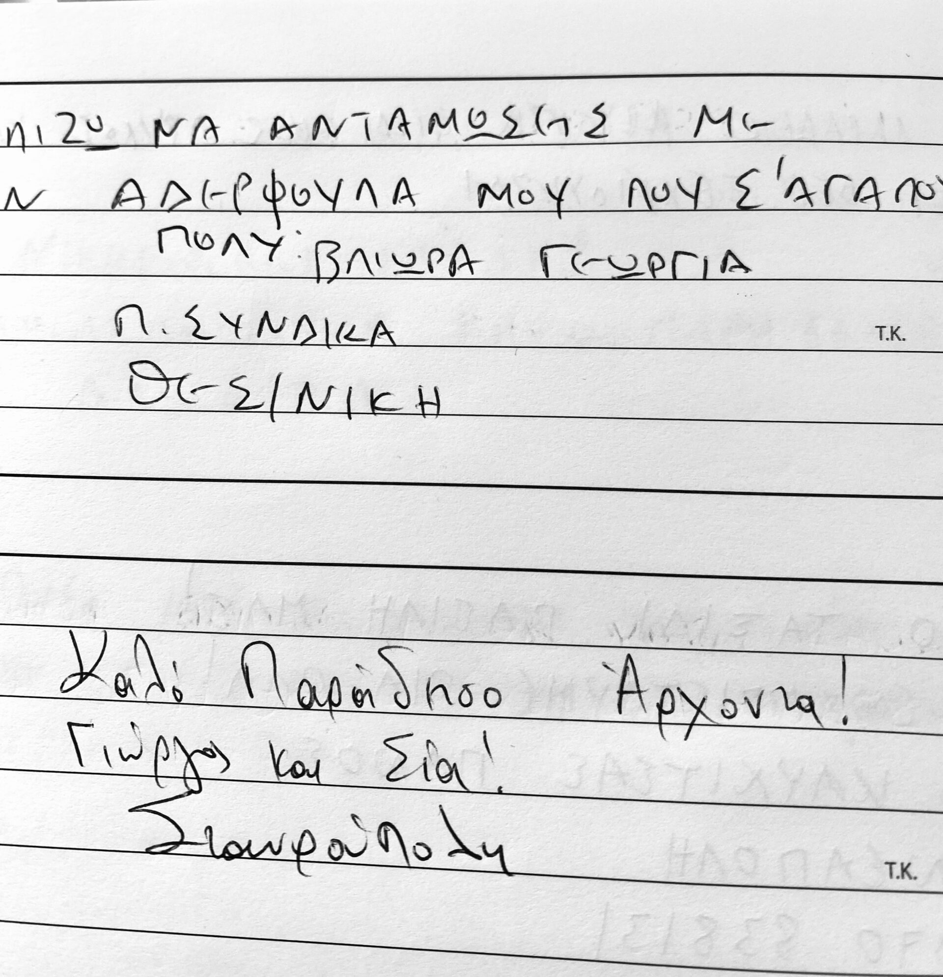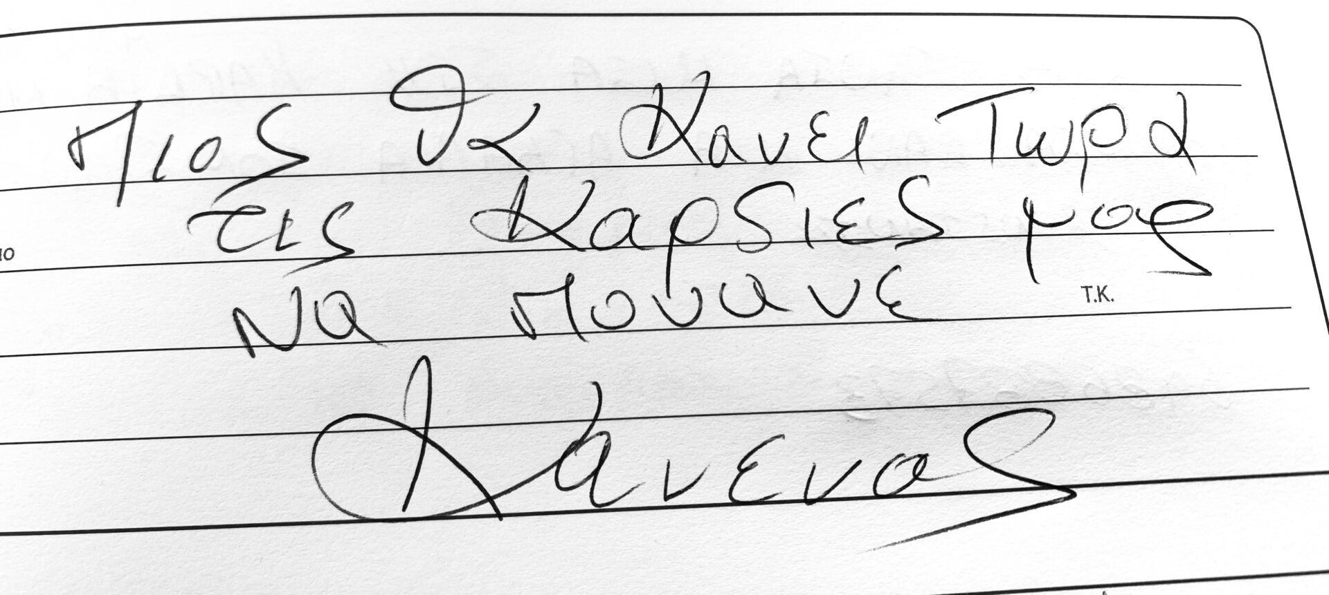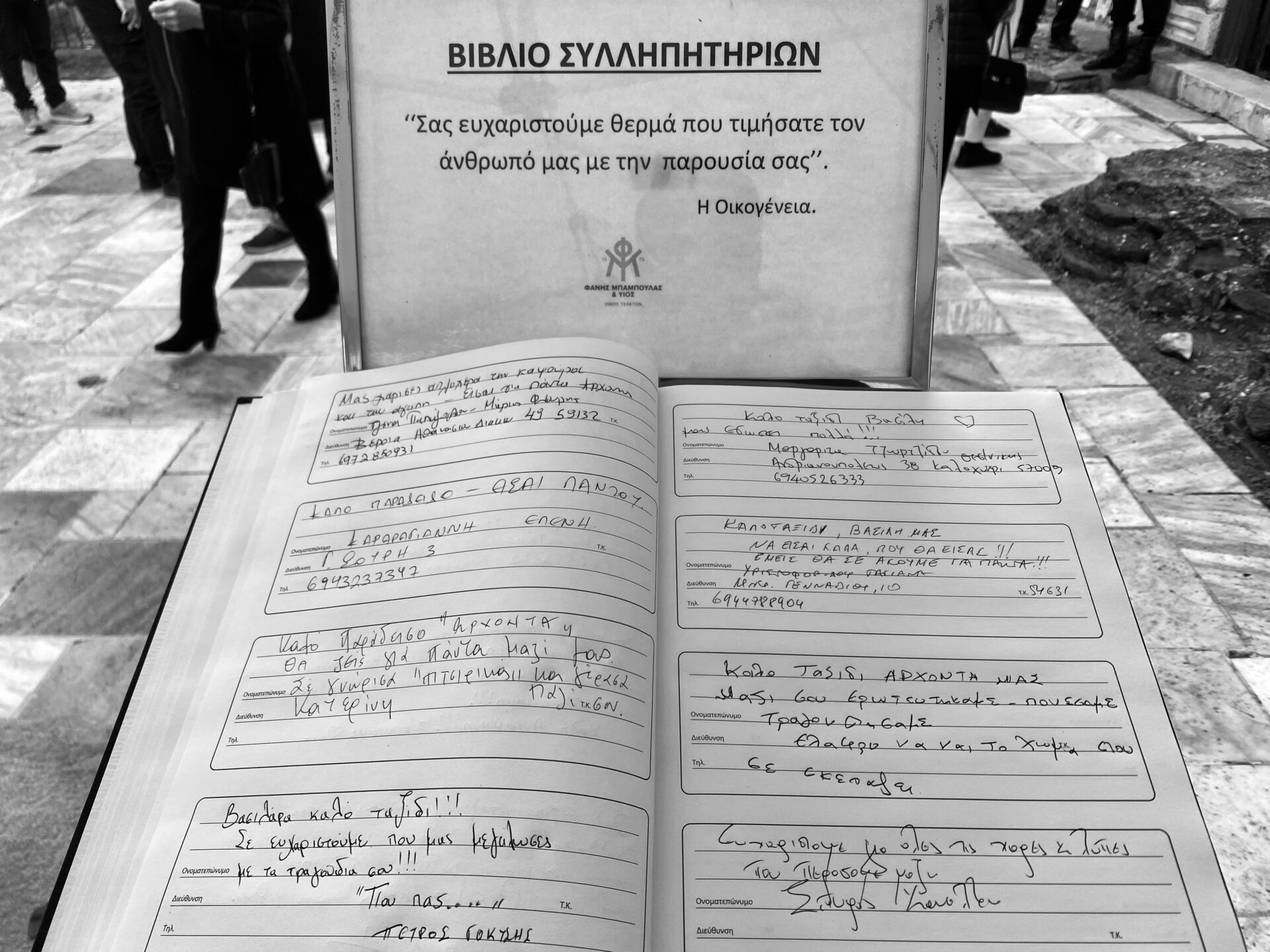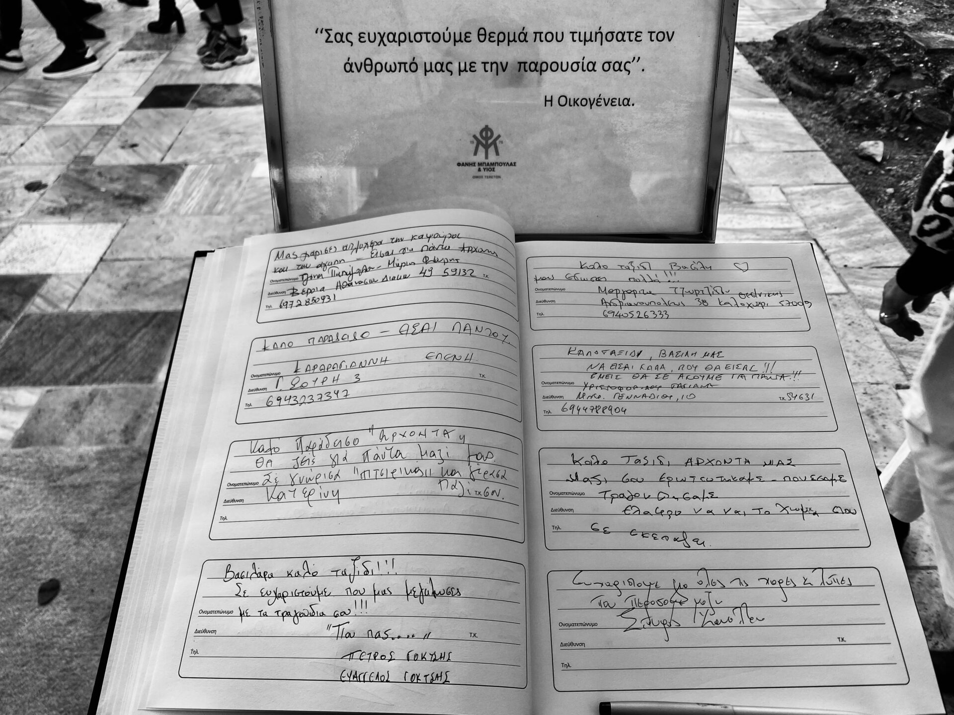 Διαβάζω τα δυο βιβλία συλλυπητηρίων. Αποχαιρετισμοί γραμμένοι με κεφαλαία, άτσαλα και συχνά ανορθόγραφα γράμματα. Καρδιά λέξεις.