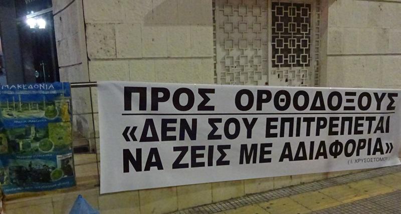 Πενήντα περίπου άτομα, που στην πλειοψηφία τους δήλωσαν ότι είναι μέλη της οργάνωσης «Ιερός Λόχος», έδωσαν ραντεβού έξω από το θέατρο, απέναντι από το Λευκό Πύργο και άρχισαν να φωνάζουν συνθήματα εναντίον της παράστασης και υπέρ του έθνους και της Ορθοδοξίας ενώ κρατούσαν μαύρα πανό με το σύνθημα Ορθοδοξία ή Θάνατος. Σε κάποια στιγμή επιχείρησαν να προσεγγίσουν το κτίριο, αλλά τους απώθησαν αστυνομικές δυνάμεις που είχαν παραταχθεί μπροστά από την είσοδο.