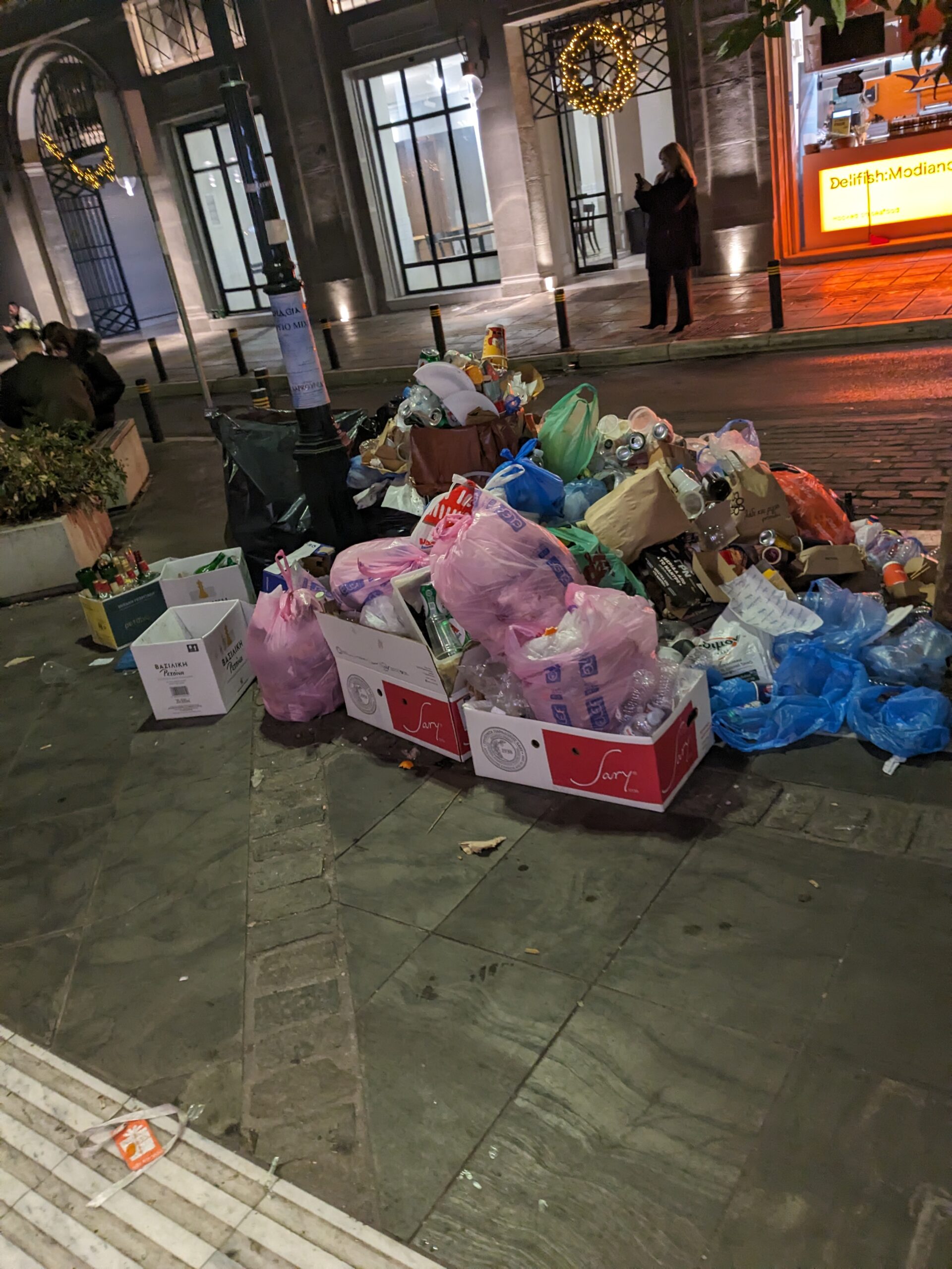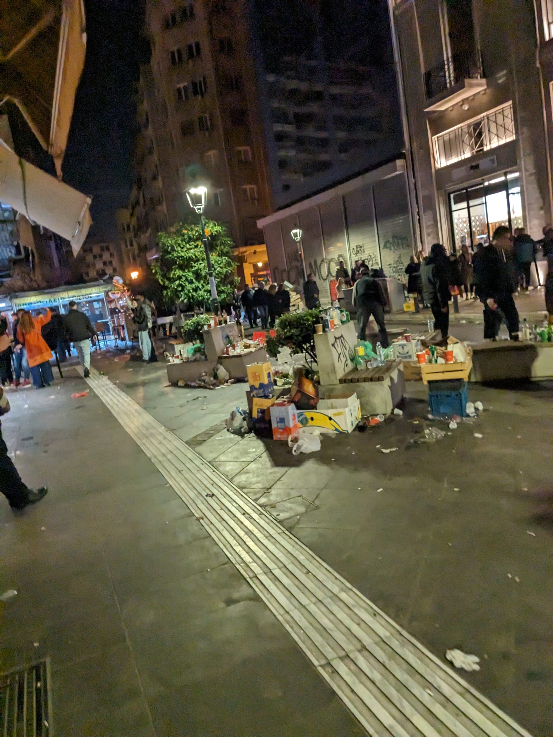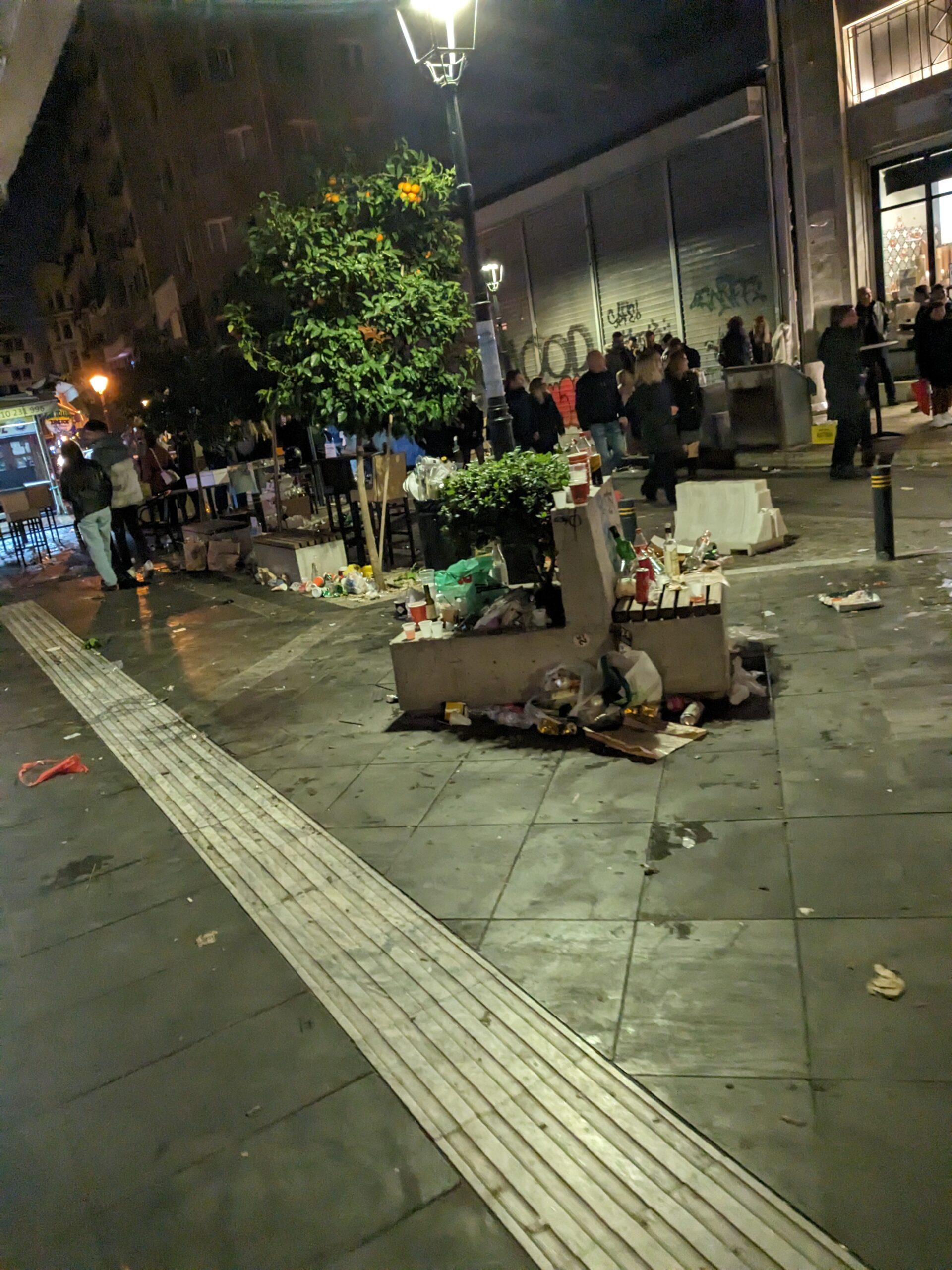 Ωστόσο μετά το μεγάλο υπαίθριο γλέντι που πραγματοποιήθηκε την Κυριακή, τα σκουπίδια γέμισαν τους δρόμους. Υπάλληλοι του δήμου βγήκαν από τα ξημερώματα της Πρωτοχρονιάς για να καθαρίσουν το χάος από τα απορρίμματα που ήταν παρατημένα σε δρόμους και πεζοδρόμια.