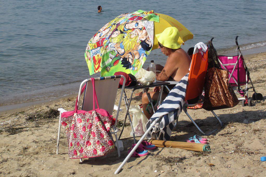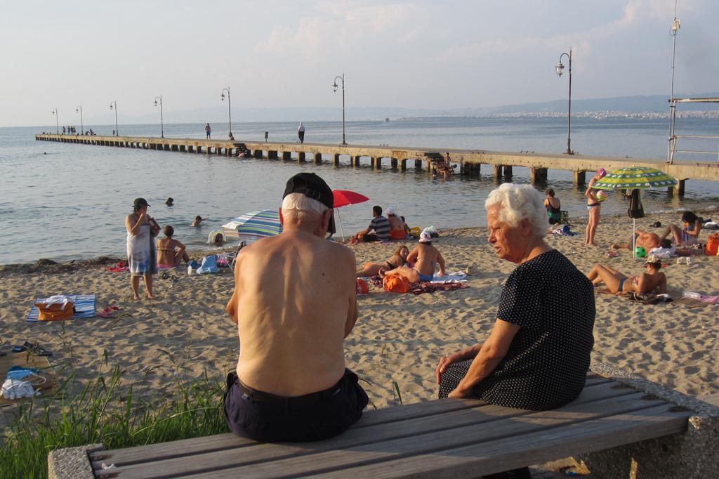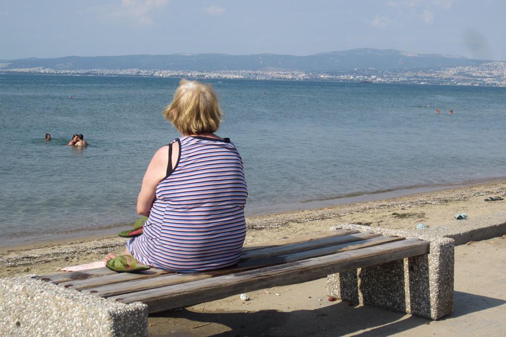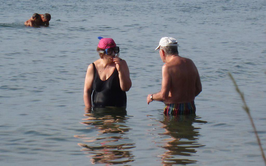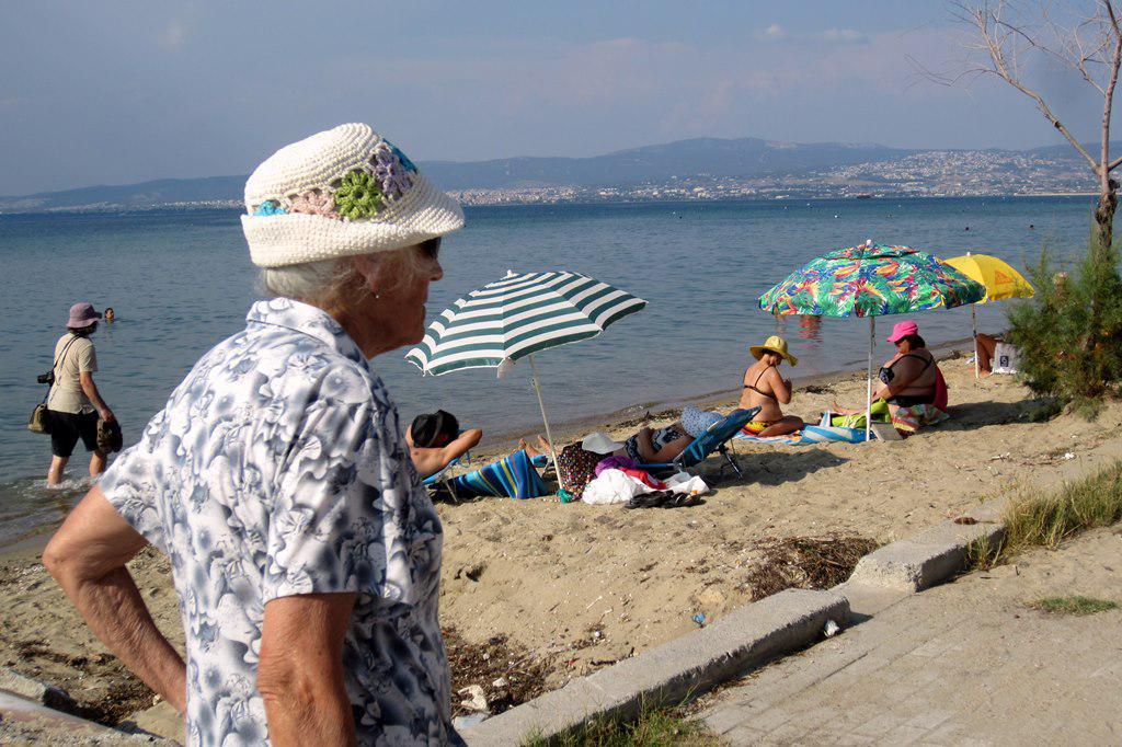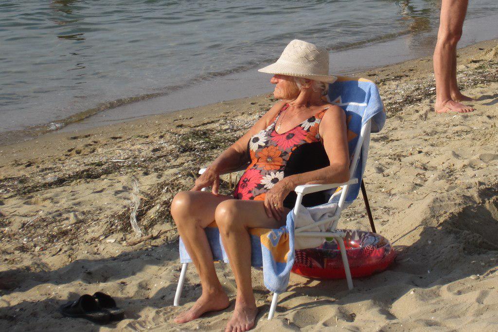 Οι κυρίες της τρίτης ηλικίας καταφθάνουν παρέες και πιάνουν κατευθείαν την ψιλοκουβεντούλα πριν ζεσταθούν αρκετά για να τολμήσουν την είσοδο στη θάλασσα με μικρά και προσεκτικά βήματα. Το κολύμπι τους περιορίζεται στα ρηχά ενώ μερικές προτιμούν να χαζεύουν εκεί που σκάει το κύμα και να απολαμβάνουν τον ήλιο.