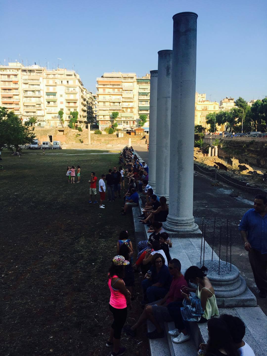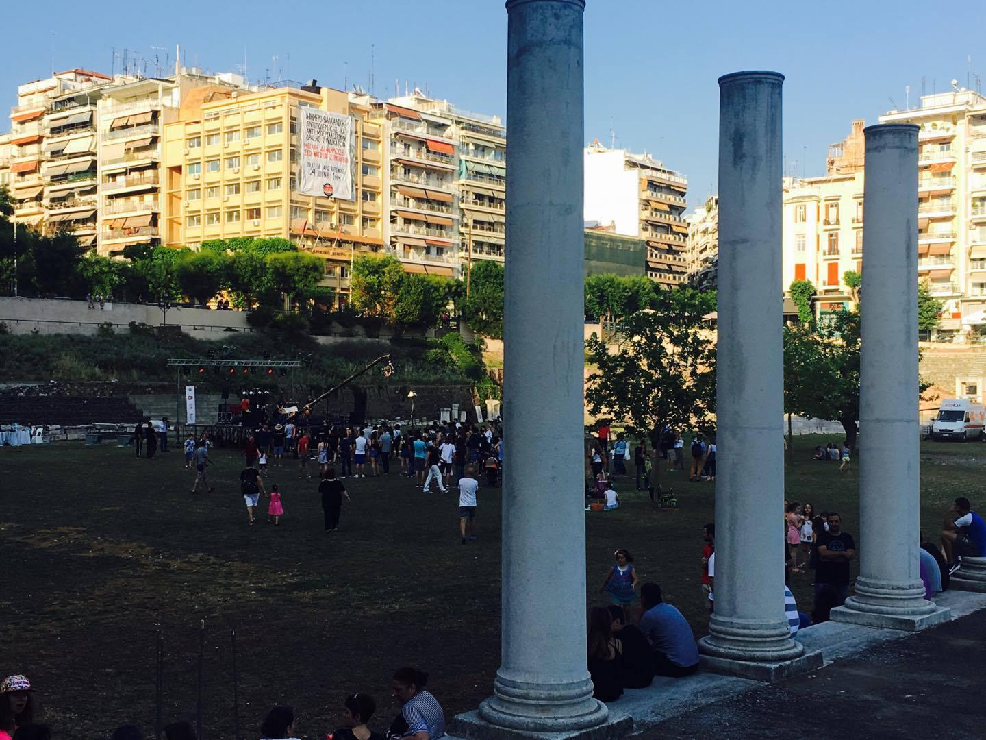 Ο κόσμος ήδη έχει αρχίσει να μαζεύεται στον υπέροχο αρχαιολογικό χώρο της Ρωμαϊκής Αγοράς, στην πλειοψηφία τους νέοι, αφού σήμερα εκεί ροκάρουν τα νεανικά συγκροτήματα της πόλης.