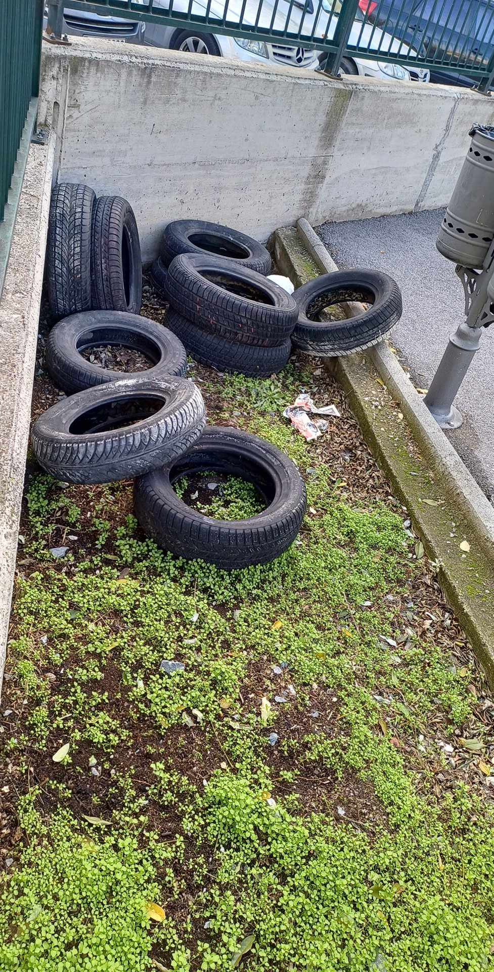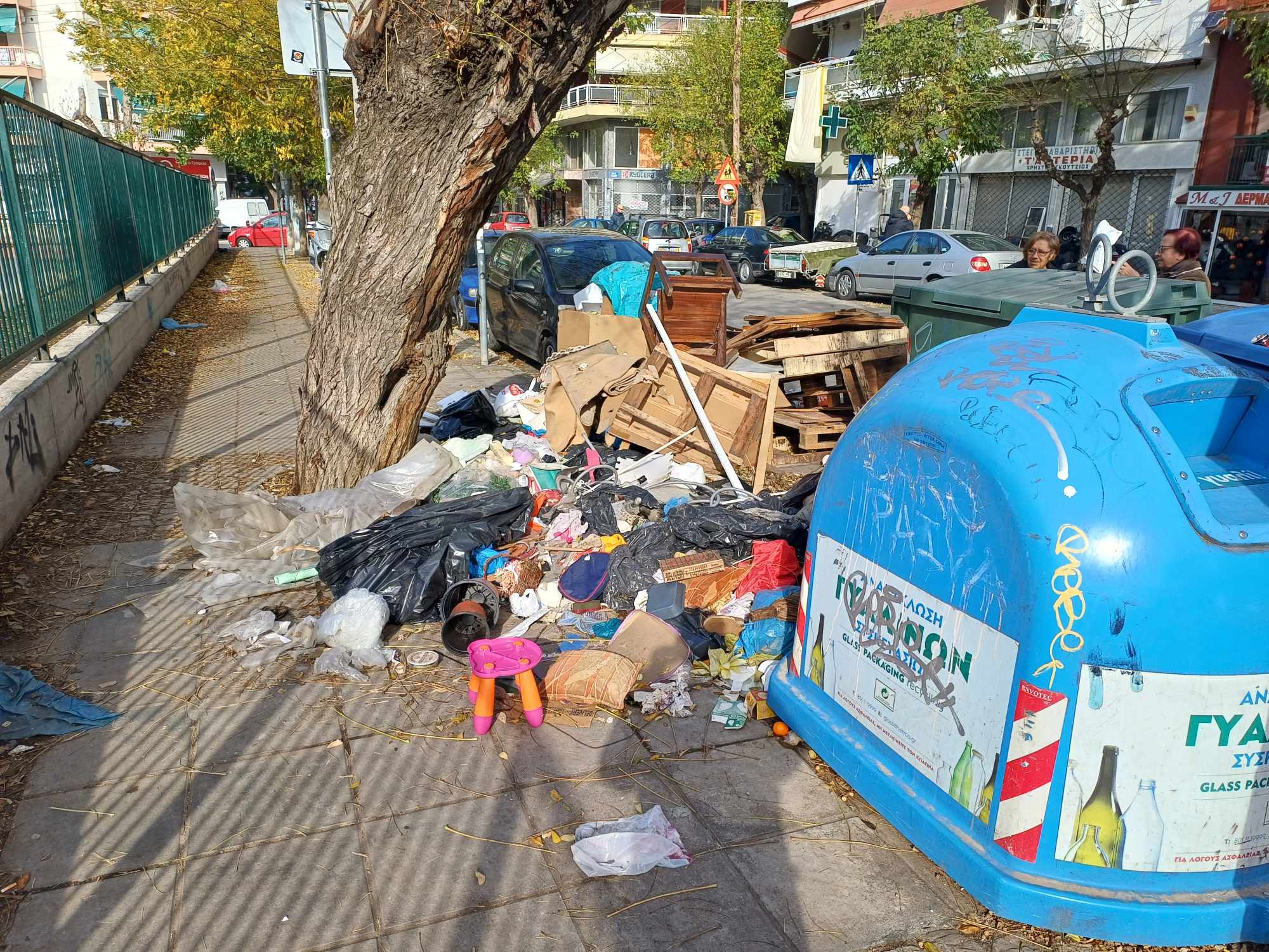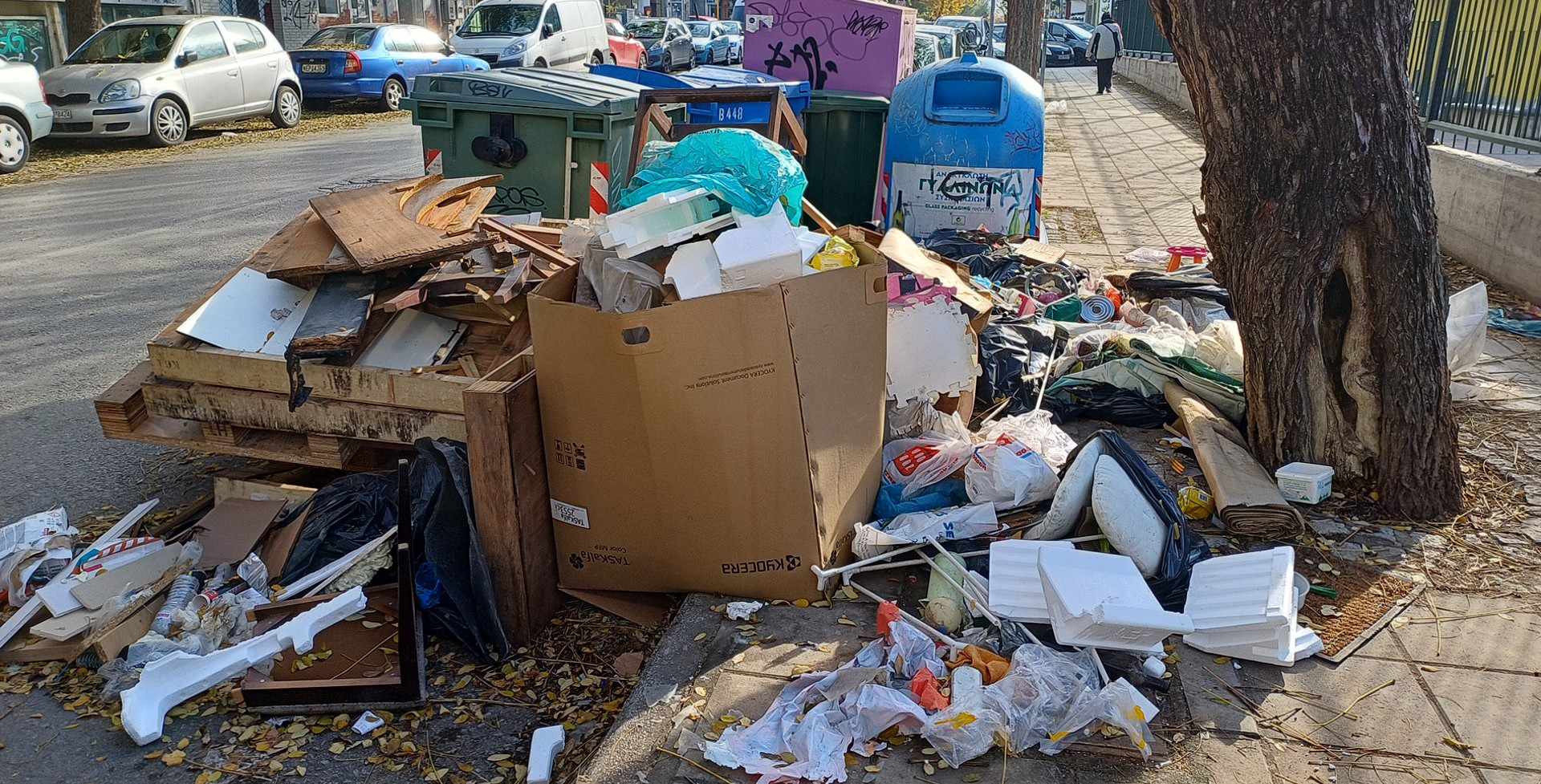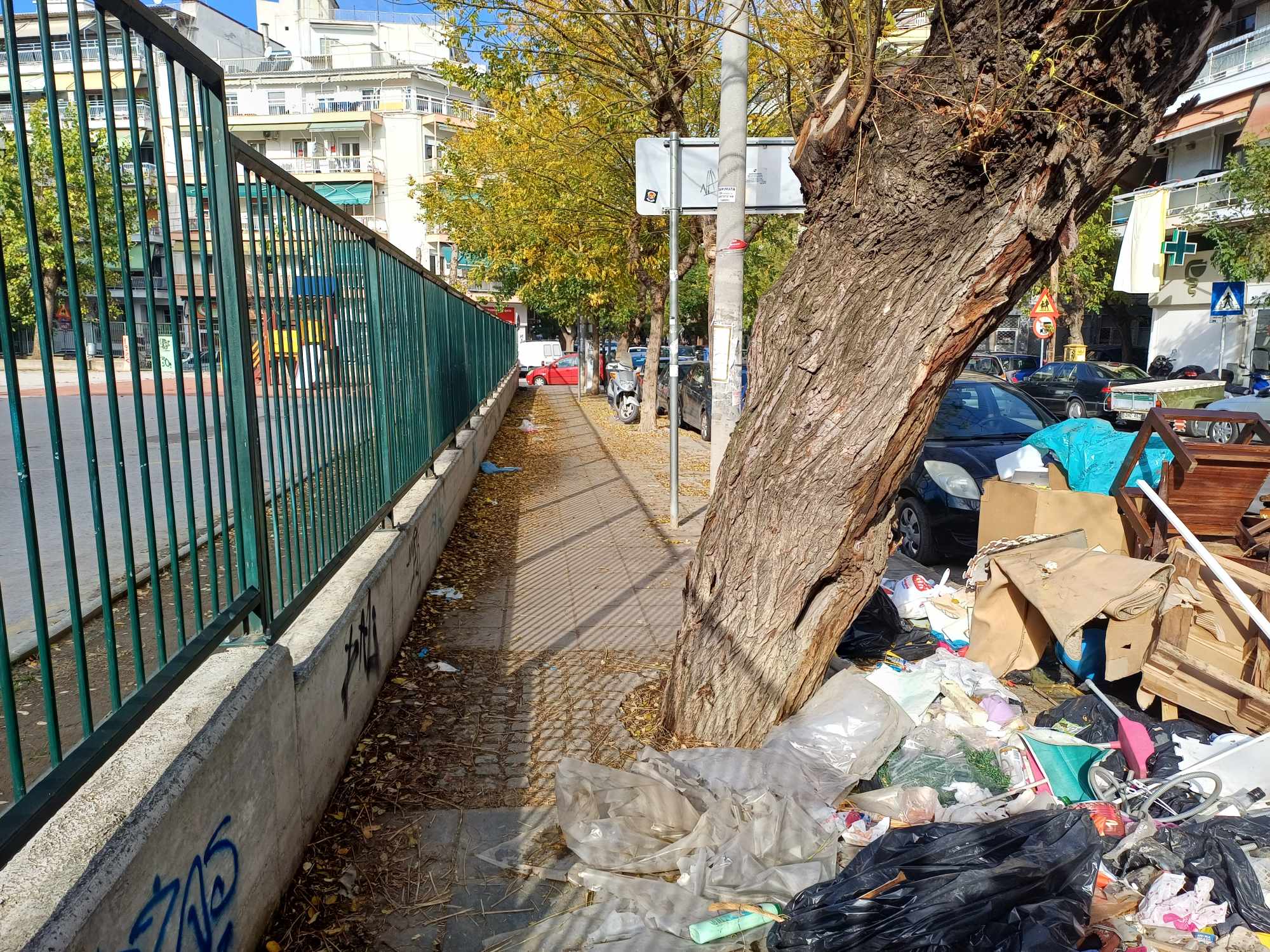 Πεταμένα πάνω σε σχεδόν όλο το μήκους του πεζοδρομίου βρίσκονται σκουπίδια, μπάζα αλλά και πεταμένα λάστιχα αυτοκινήτων.