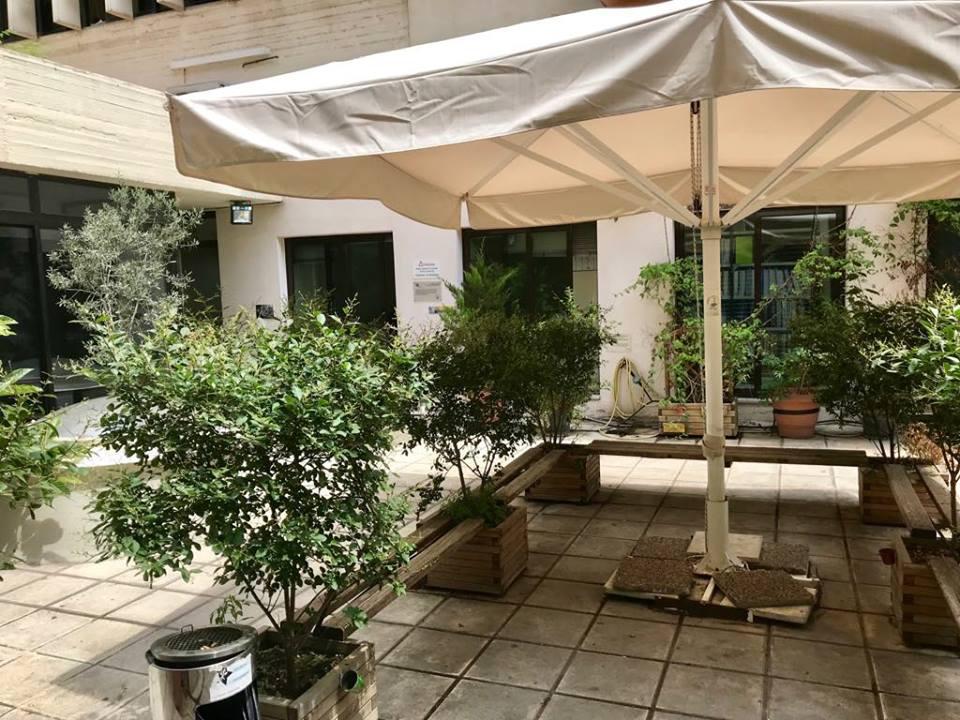 Ακριβώς απέναντι από την πανέμορφη αυλή με τα ποδήλατα, βρίσκεται άλλο ένα αίθριο, το οποίο προσφέρει παγκάκια για να κάθονται οι φοιτητές και μια ομπρέλα για σκιά. Αποτελεί έναν όμορφο μικρό χώρο, για να περνάνε οι φοιτητές τα διαλείμματα τους και να ξεκουράζονται τις κενές ώρες.