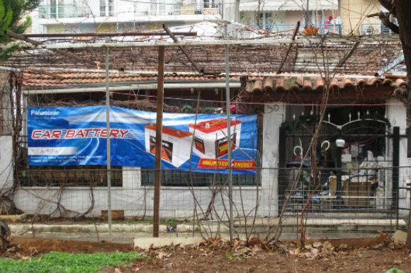 Αφού μπορούσε ο χριστιανός, γιατί να μην γλυτώσει κόπο, χρόμο και κάποια από τα κατασκευαστικά υλικά; Η θέση περίφημη καθώς τα νώτα του προφυλάσσονται (αφού φρόντισαν κάποιοι παλιοί και ξεχασμένοι κάτοικοι της πόλης για την οχύρωσή του). Μην πηγαίνει κι άχρηστο το τείχος… Την πρόσοψη κρατά μακριά από τα αδιάκριτα βλέμματα ένα καλαίσθητο πανό: “Car battery, Unlimited energy” (σαν απειλή μου σκούγεται).