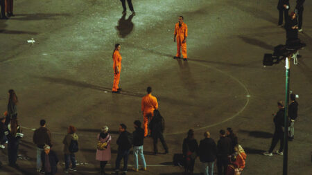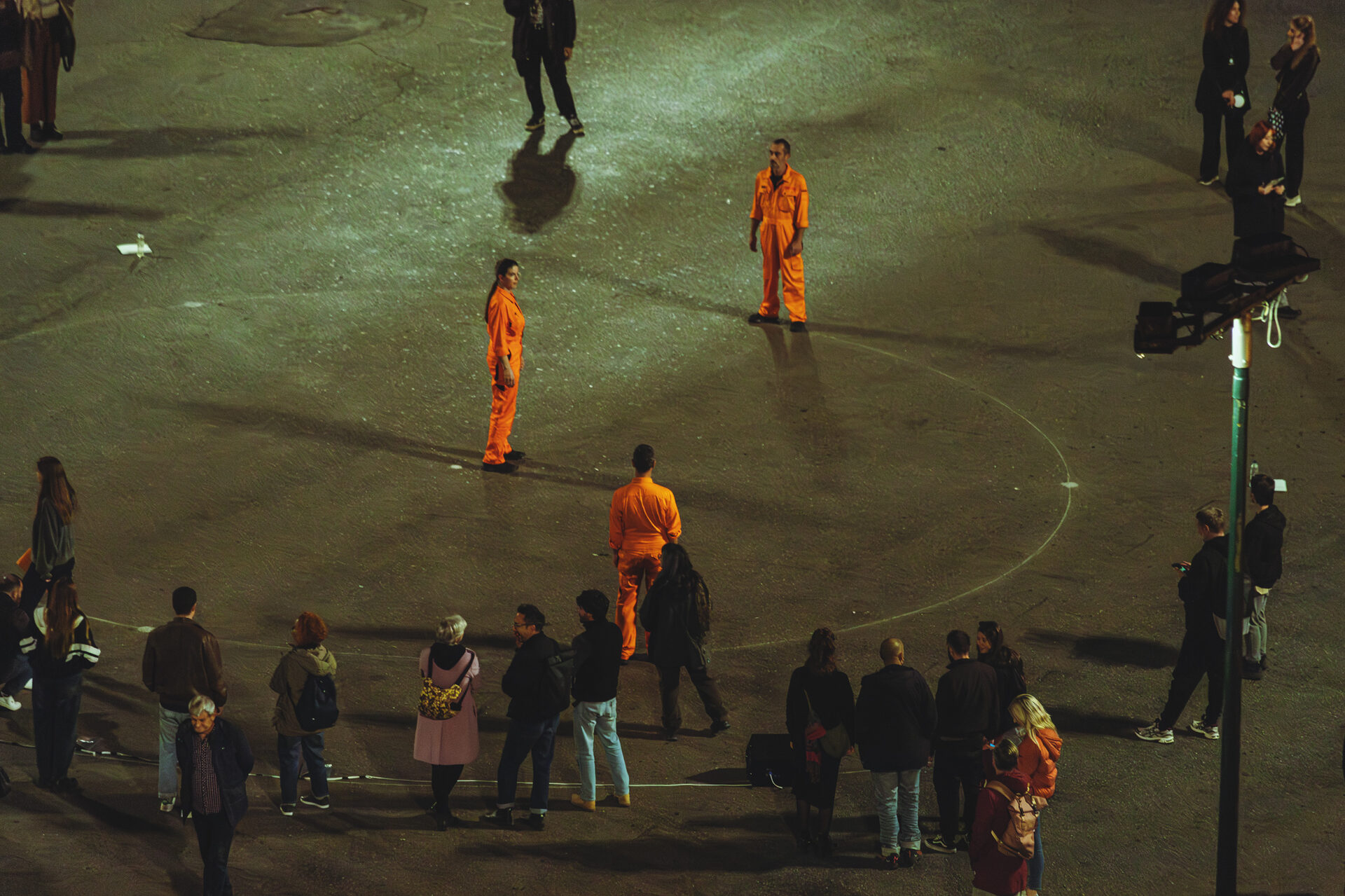Μέσα σε έναν κύκλο διαμέτρου δέκα μέτρων, οι τρεις καλλιτέχνες κινούνται αδιάκοπα σε επαναλαμβανόμενες διαδρομές, στον ρυθμό ενός ηλεκτρικού μετρονόμου που ακούγεται με ενίσχυση στον χώρο.