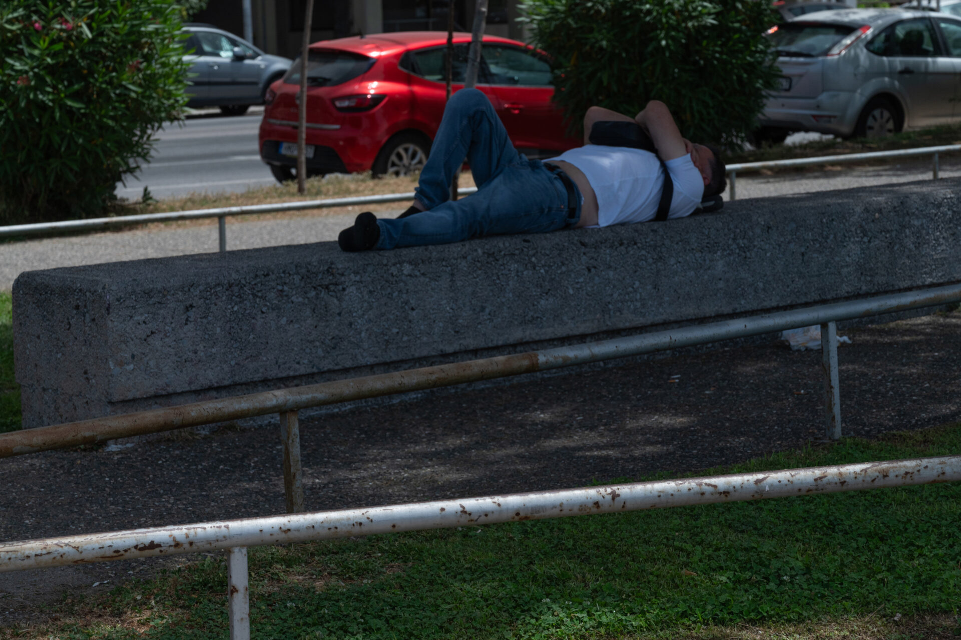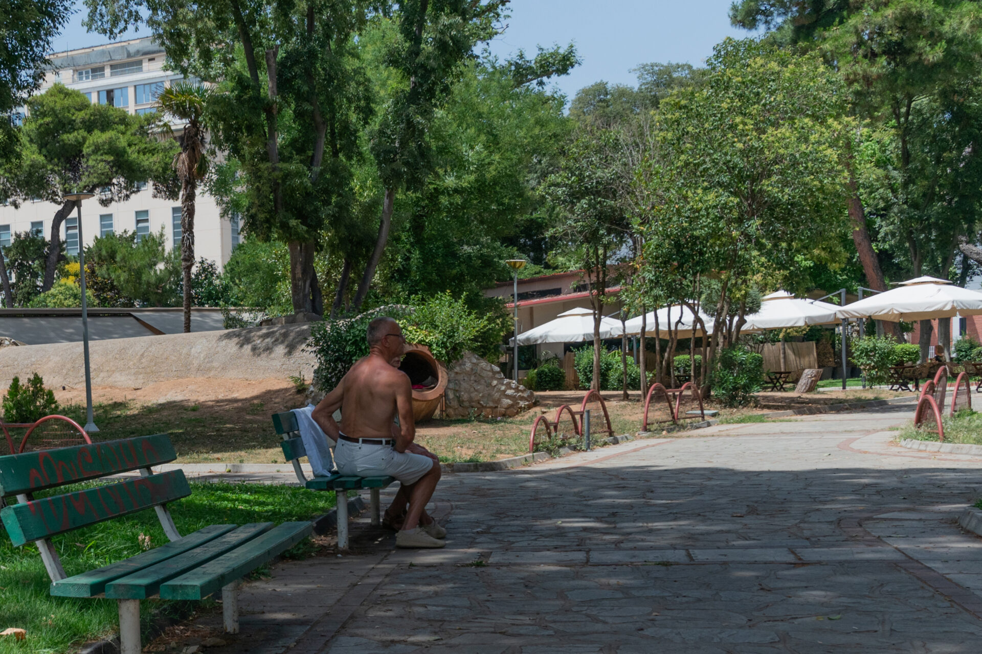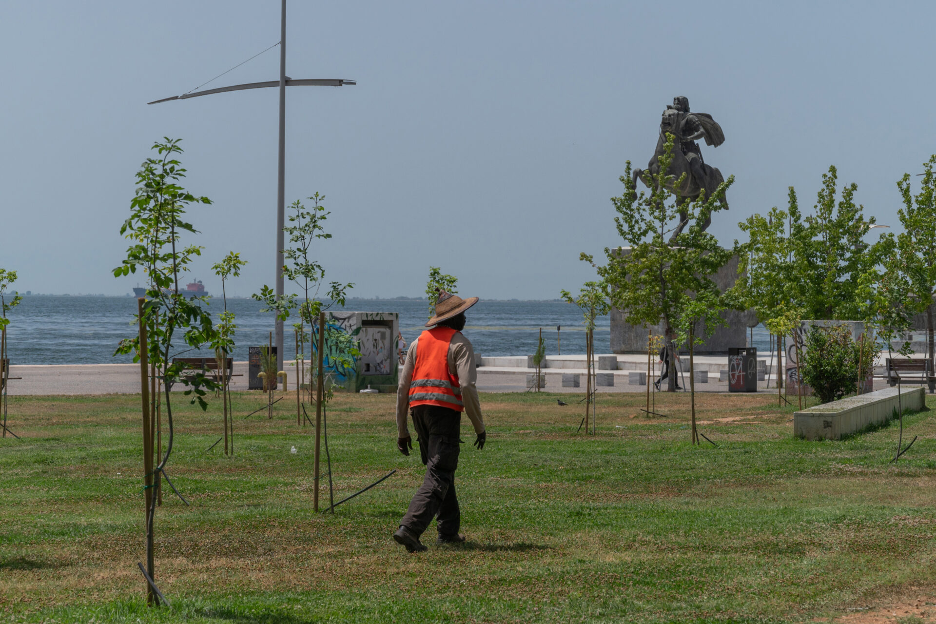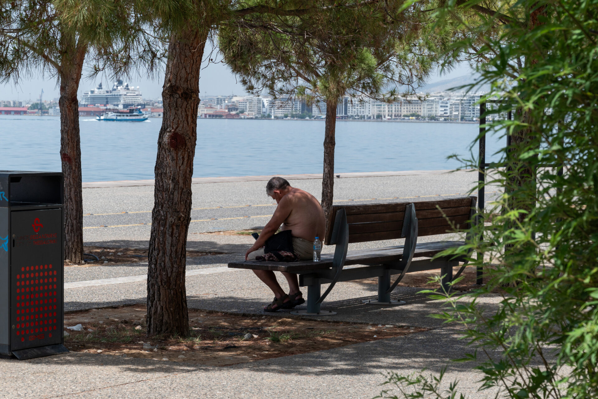 Μέσα σε αυτό το κλίμα, κάτοικοι της Θεσσαλονίκης αποφάσισαν να βρουν καταφύγιο δροσιάς πέριξ του Λευκού Πύργου, στην Παραλία Θεσσαλονίκης, όπου τα σκιερά πάρκα, τα σιντριβάνια και η θάλασσα φαίνεται να βελτιώνουν κάπως την εικόνα απόλυτης ζέστης που επικρατεί. Ακόμα όμως και σε αυτές τις συνθήκες, κάποιοι δουλεύουν…