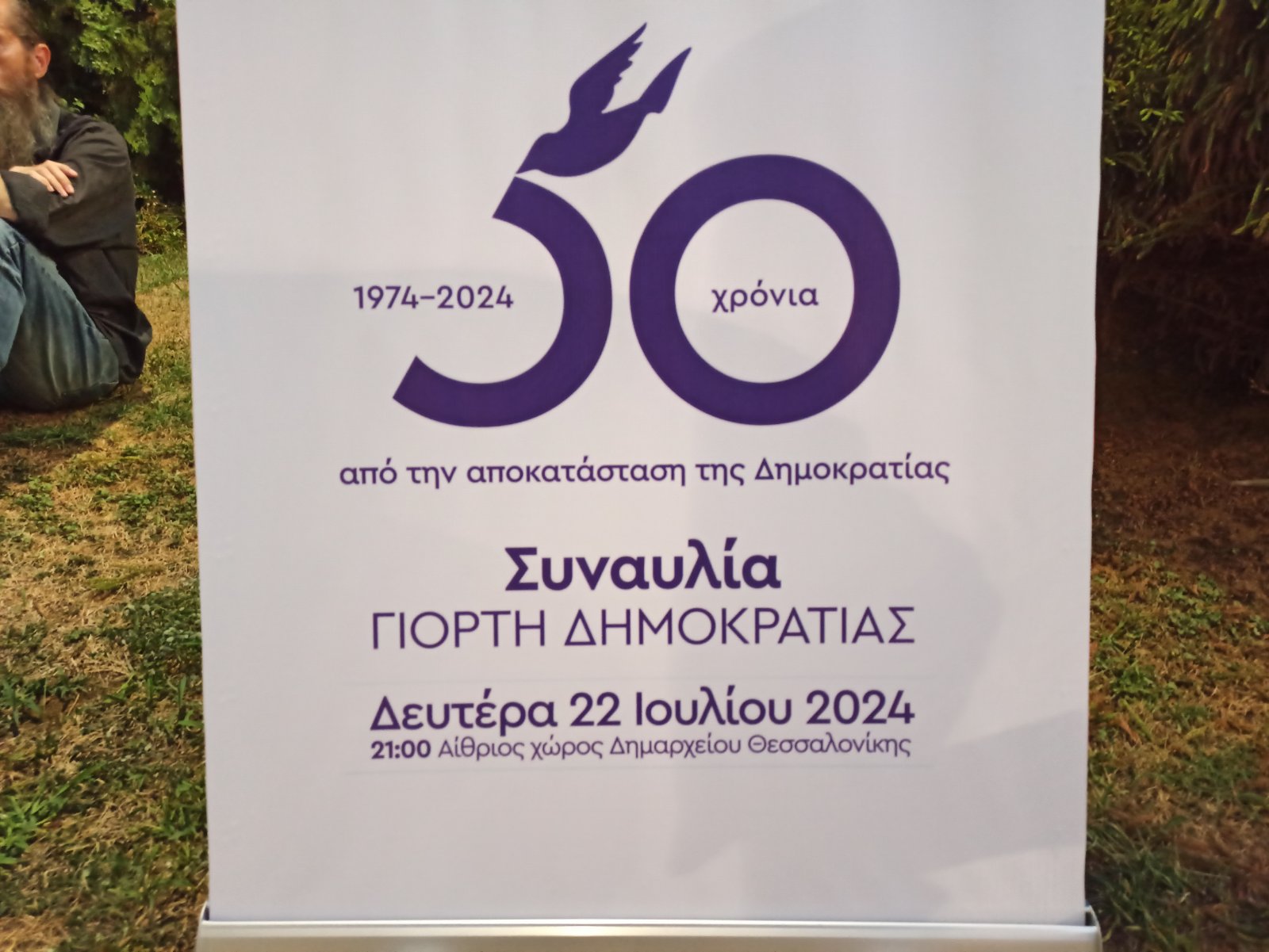 Στις 21:00 ξεκίνησε η εκδήλωση που διοργάνωσε ο δήμος Θεσσαλονίκης, με αφορμή την επέτειο των 50 χρόνων από την αποκατάσταση της Δημοκρατίας στην Ελλάδα με τίτλο «Γιορτή Δημοκρατίας» τη Δευτέρα 22 Ιουλίου 2024 στο Αίθριο του Δημαρχείου Θεσσαλονίκης.