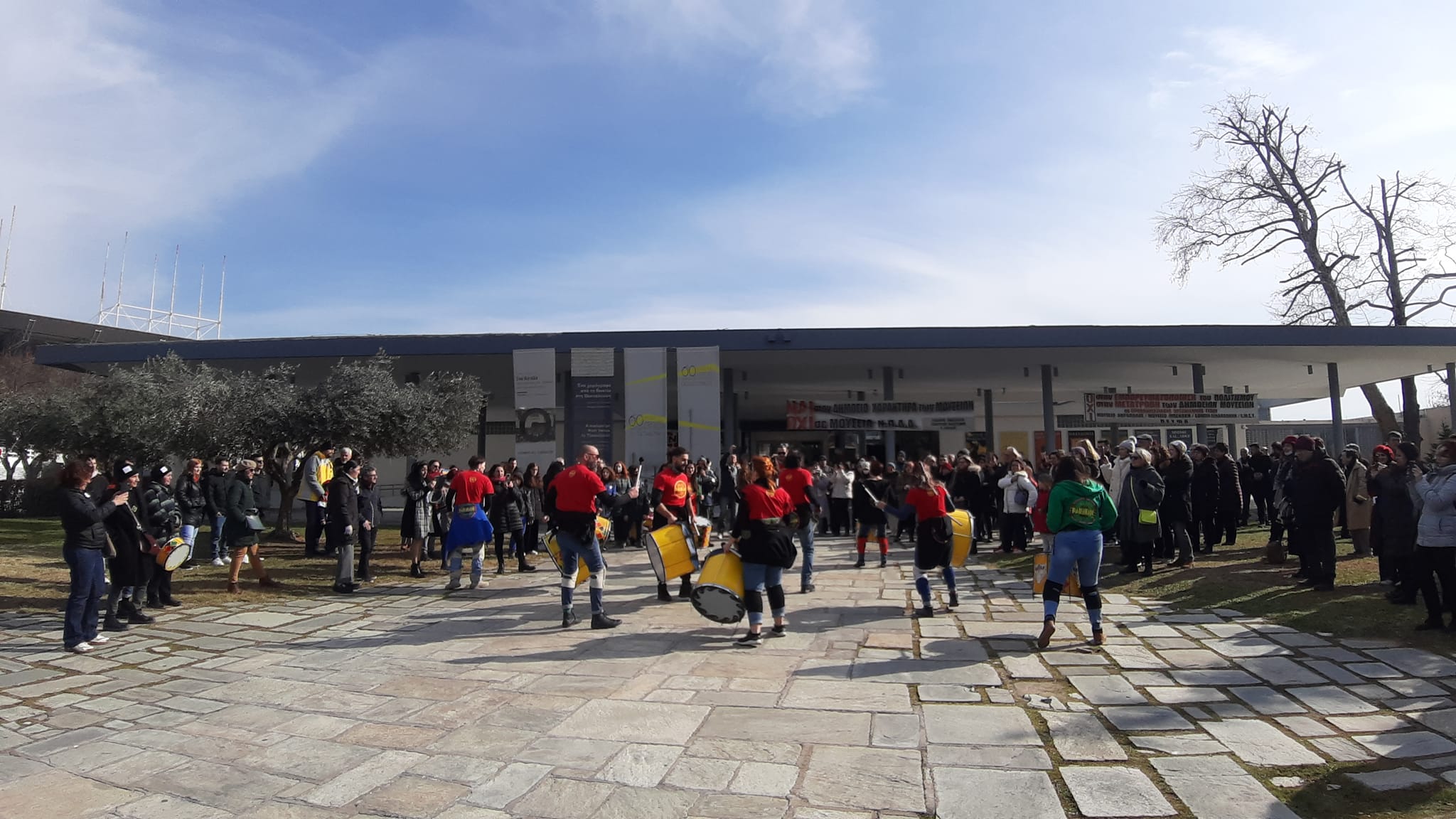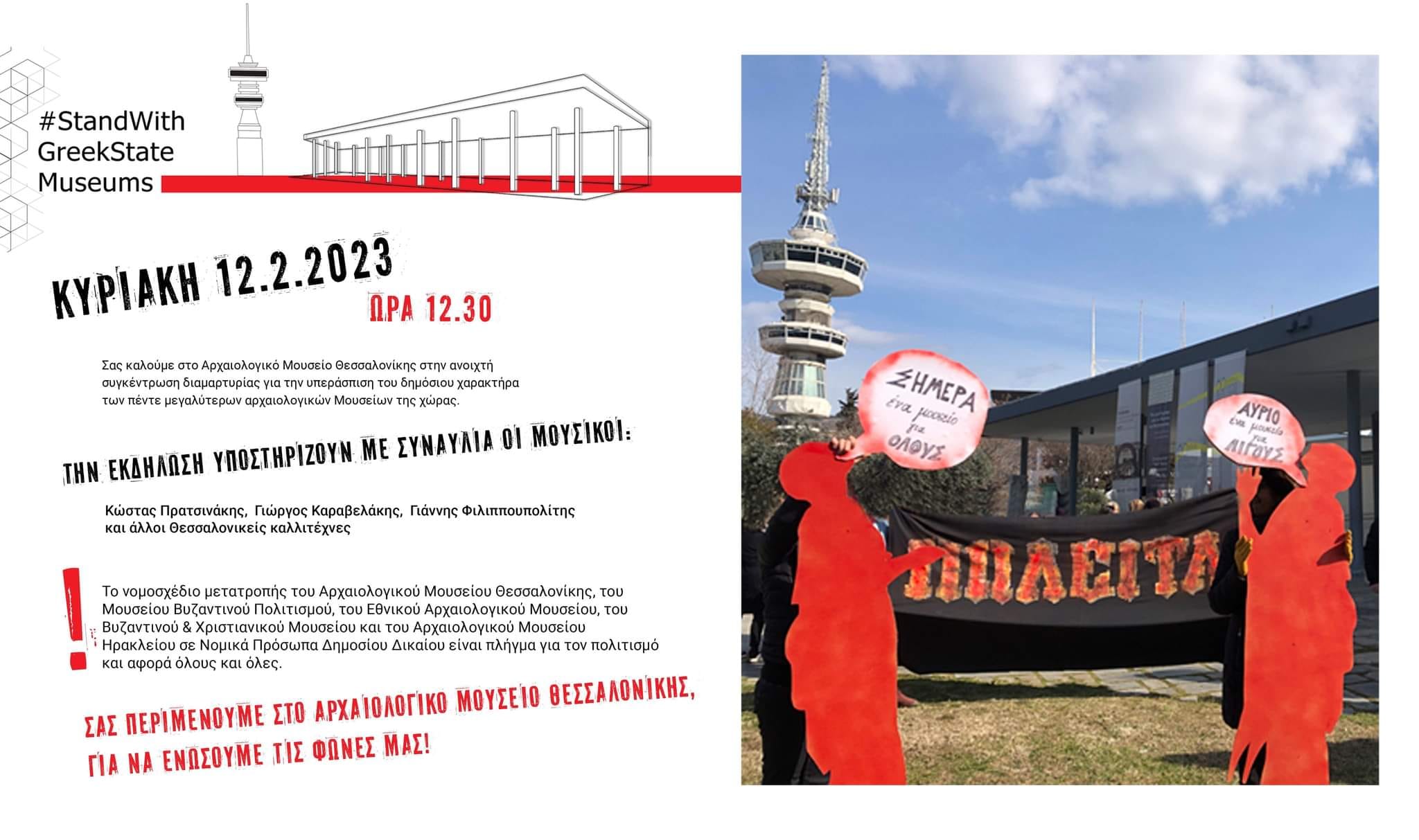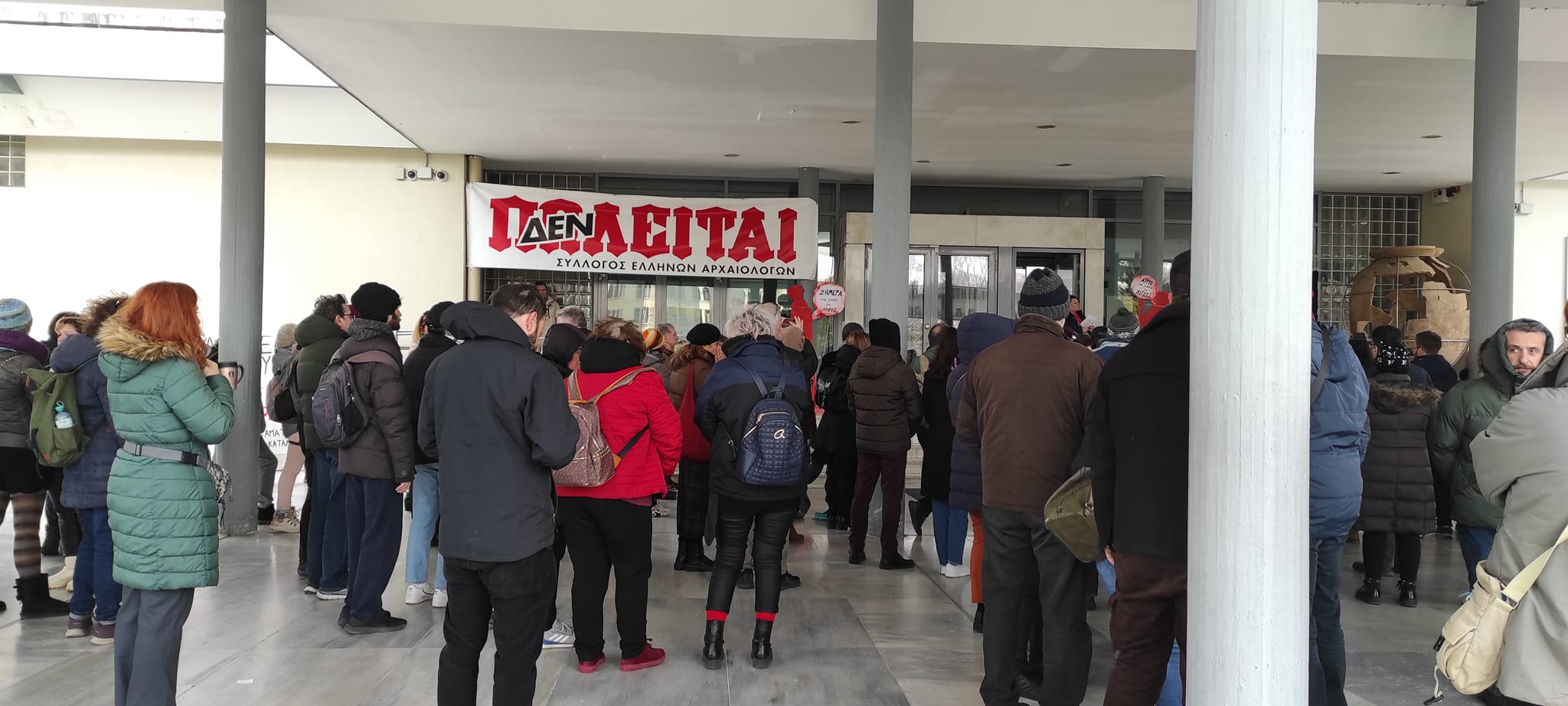 Συγκέντρωση έξω από το Αρχαιολογικό Μουσείο Θεσσαλονίκης πραγματοποιήθηκε το μεσημέρι της Κυριακής (12/02). Πρόκειται για διαμαρτυρία, που γίνεται στο πλαίσιο των δράσεων που διοργανώνονται από τον Σύλλογο Ελλήνων Αρχαιολόγων από κοινού με τον Ενιαίο Σύλλογο Αττικής-Στερεάς-Νήσων, την ΠΕΣΑ και ΠΑΣΥΠΑΤΕ, για την «υπεράσπιση του δημόσιου χαρακτήρα των Μουσείων».