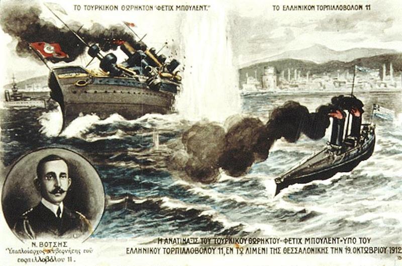 **Το τουρκικό θωρηκτό Φετίχ Μπουλέντ, εκτοπίσματος 2710 τόνων, ναυπηγήσεως του 1871, επισκευασθέν και εκσυγχρονισθέν το 1906, τορπιλίστηκε και βυθίστηκε από το ελληνικό τορπιλοβόλο Nο 11 με Kυβερνήτη τον Yποπ/ρχο Nικόλ. Bότση, ενώ βρισκόταν αγκυροβολημένο στο λιμένα της Θεσσαλονίκης. Το κουφάρι του βρίσκεται ακόμη στον πάτο του Θερμαϊκού