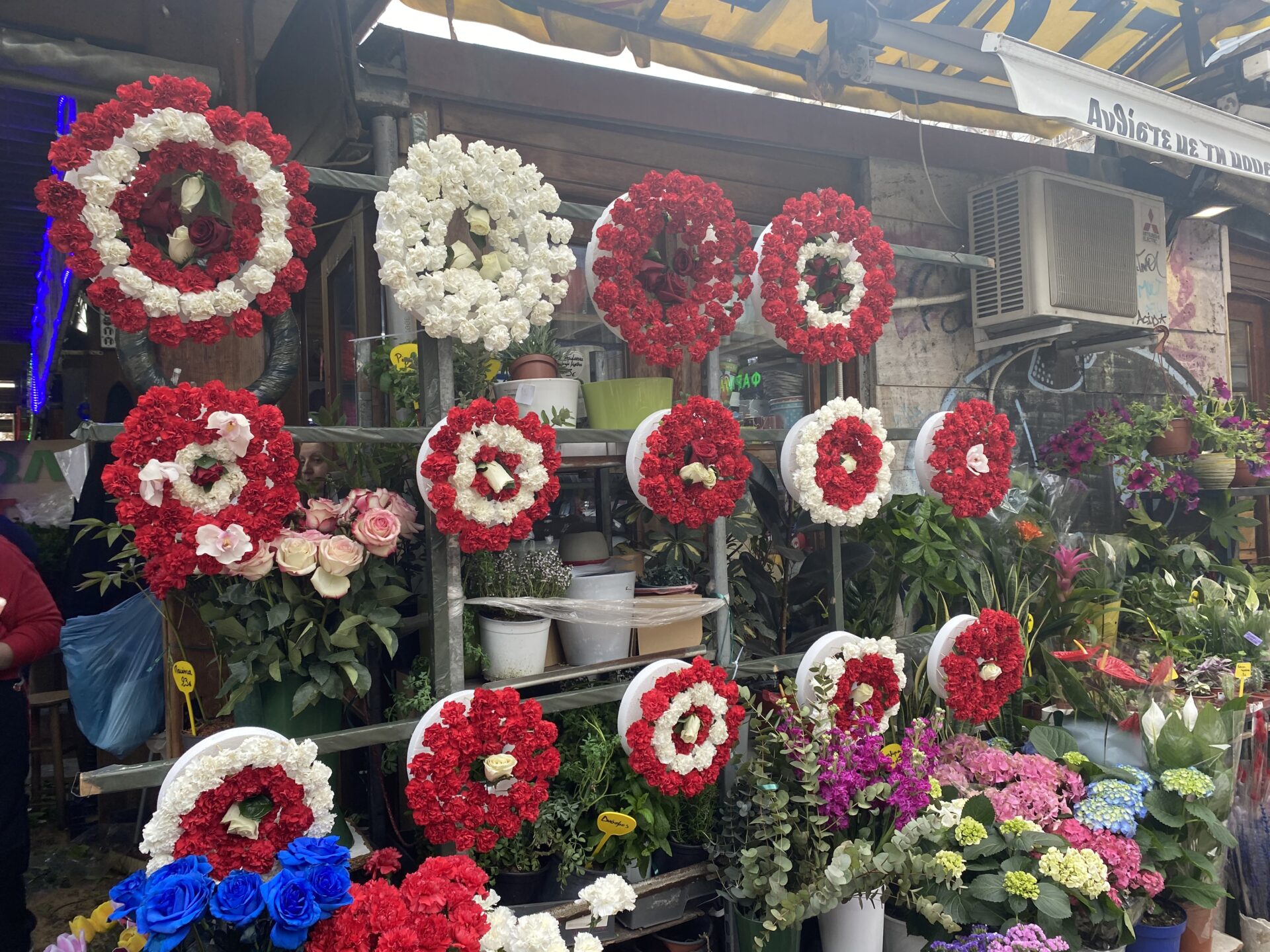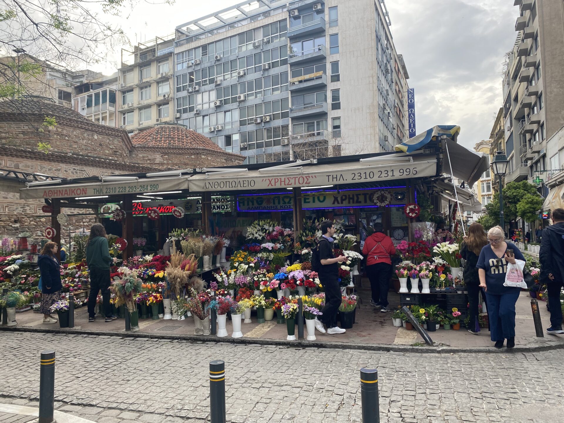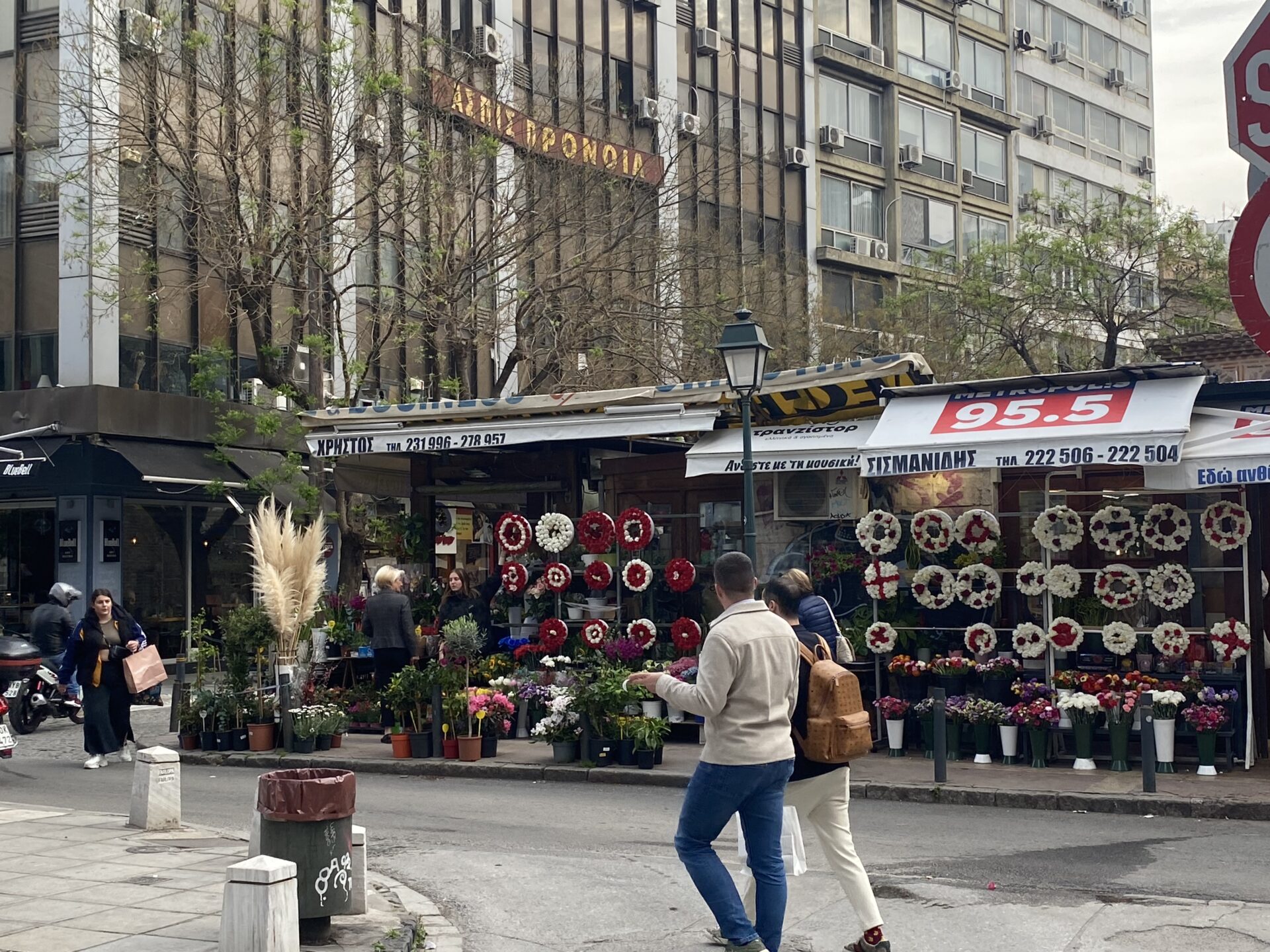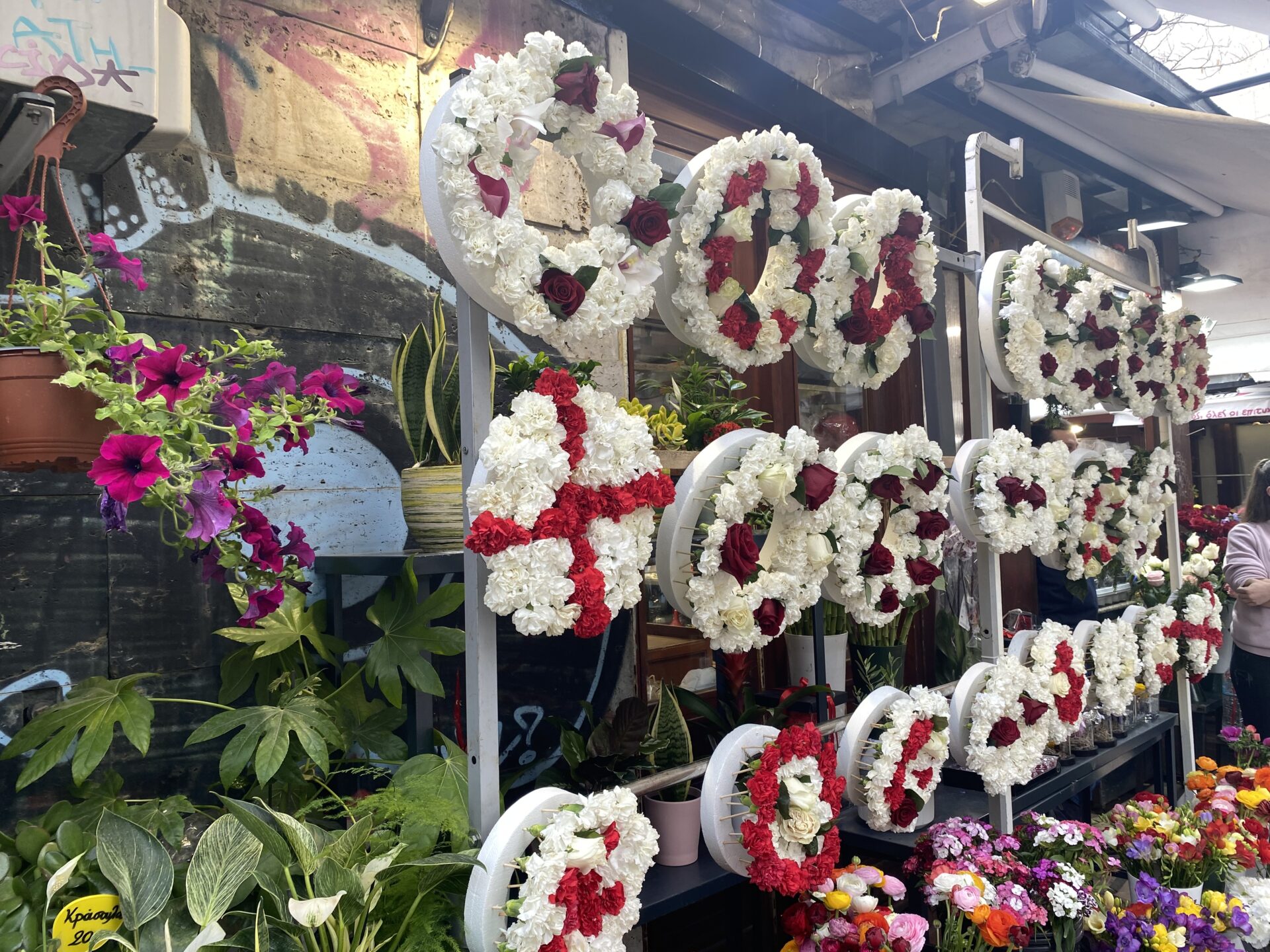 Λίγο πιο πέρα, στα Λουλουδάδικα, η άνοιξη επελαύνει με χρώματα η κίνηση είναι επίσης αυξημένη. Στα ανθοπωλεία ο κόσμος μαζεύεται, κοιτάζει λουλούδια. «Περισσότερο φεύγουν τα γαρύφαλλα, έχουμε και τα στεφανάκια τα οποία έχουν μεγάλη ζήτηση λόγω της ημέρας και του Πάσχα γενικότερα. Το στεφάνι ως σύμβολο, ως κίνηση, ως συνέχεια μιας παράδοσης…