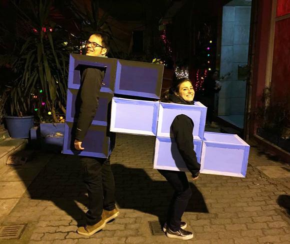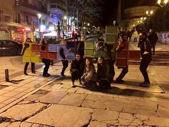 Μια διαφορετική και πρωτότυπη ομαδική μεταμφίεση βρήκαμε στους δρόμους της πόλης αυτή την Τσικνοπέμπτη. Όσοι αγάπησαν το παιχνίδι που γνωρίσαμε όλοι την δεκαετία του ’90, θα το αναγνωρίσουν αμέσως. Και μια ομάδα νέων το ξαναζωντάνεψε σχηματίζοντας ένα ανθρώπινο tetris, καθώς η στολή αποδείχτηκε διαδραστική, με άτομα να τους αναδιατάσσουν στο δρόμο, «παίζοντας» το παιχνίδι. Η ιδέα για την ενδιαφέρουσα «στολή» ήταν κατά βάση της Χαρούλας Αδαμοπούλου, που είναι και εικαστικός, και του Στέλιου Κουράκη, ενώ συμμετείχαν ομαδικά όλοι οι Κωνσταντίνος Βελένης, Δήμητρα Ανδρέου, Παντελής Παπαδάκης, Καλλιόπη Βουλγαρούδη, Ορέστης Κουράκης και ο Μιχάλης Βελένης, με κόστος κατασκευής 5 ευρώ ανά άτομο. Και του χρόνου.