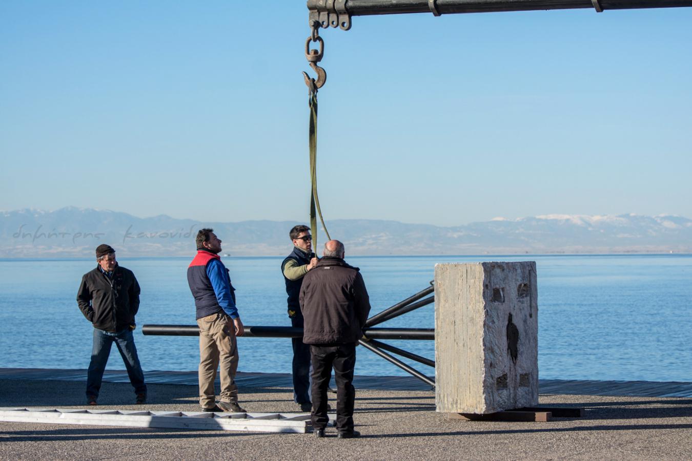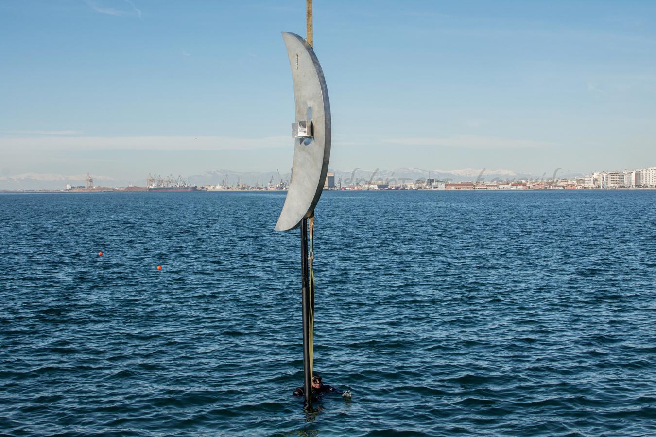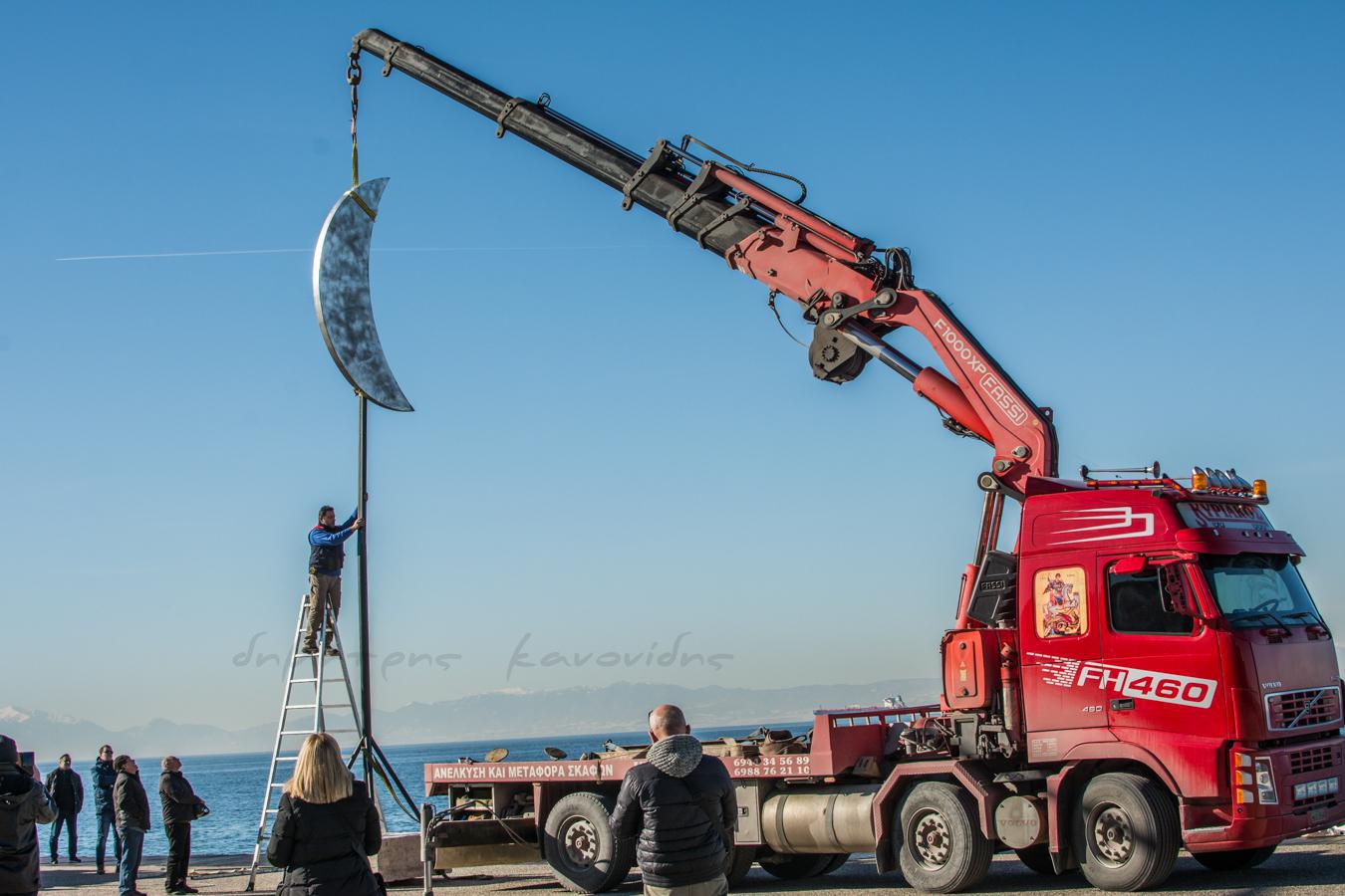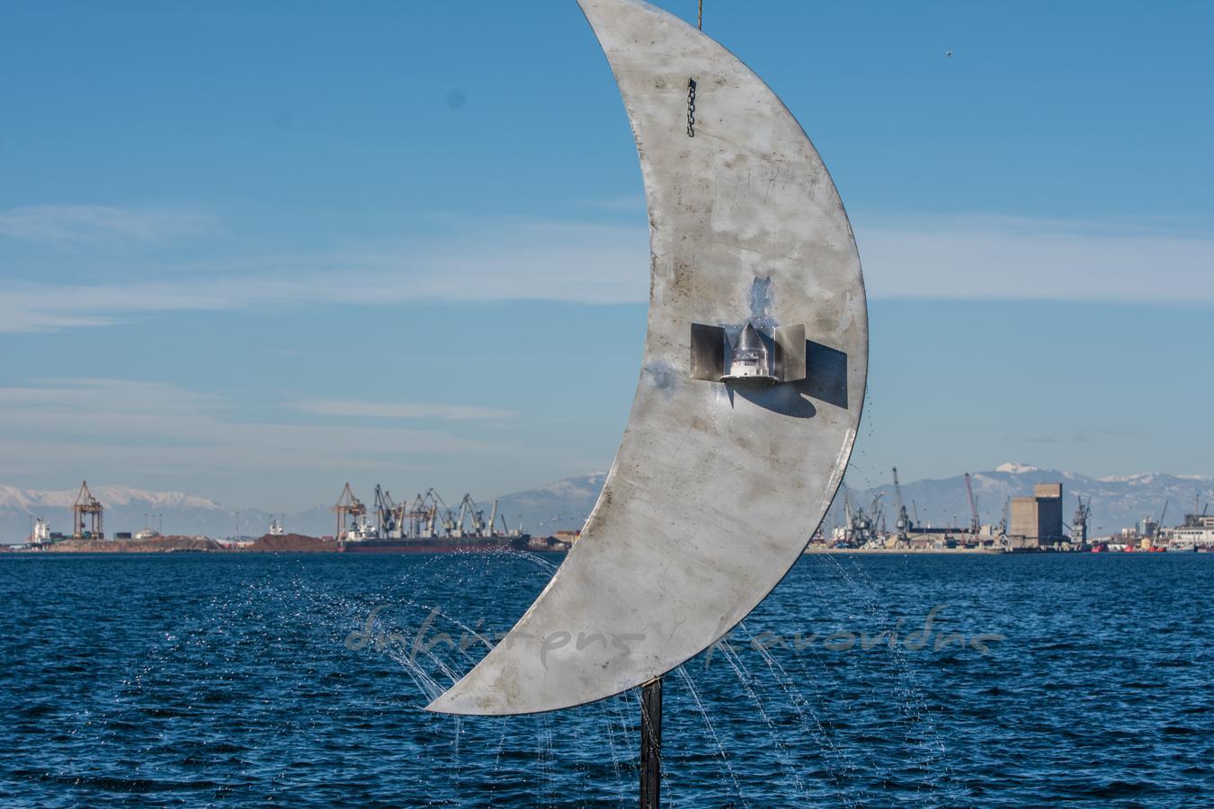 Σήμερα το πρωί ξεκίνησαν στη Νέα Παραλία οι διαδικασίες για την επανατοποθέτηση του «Φεγγαριού» του Παύλου Βασιλειάδη μέσα στη θάλασσα, ανάμεσα στην παλιά του θέση και τις ομπρέλες του Ζογγολόπουλου.
