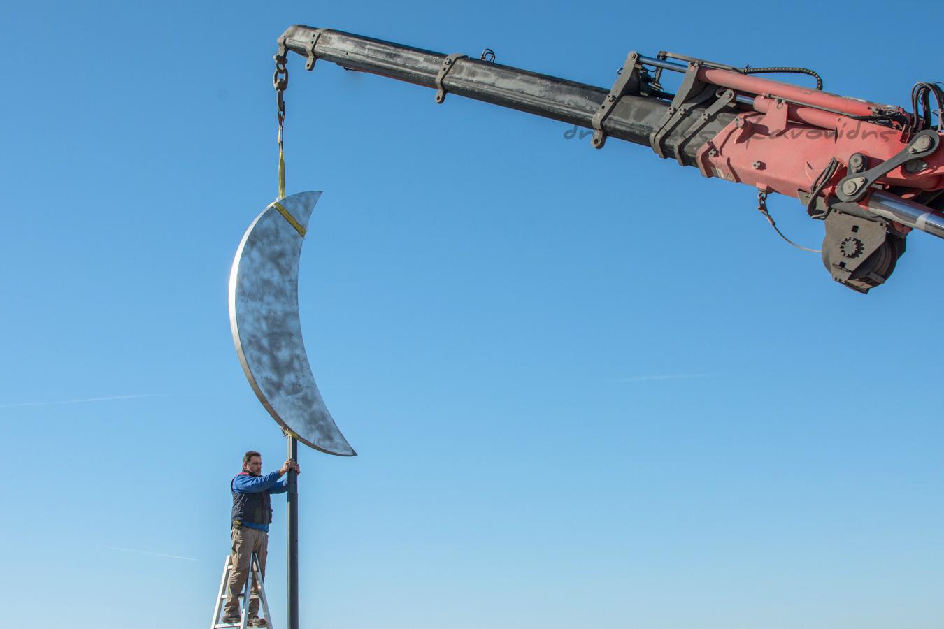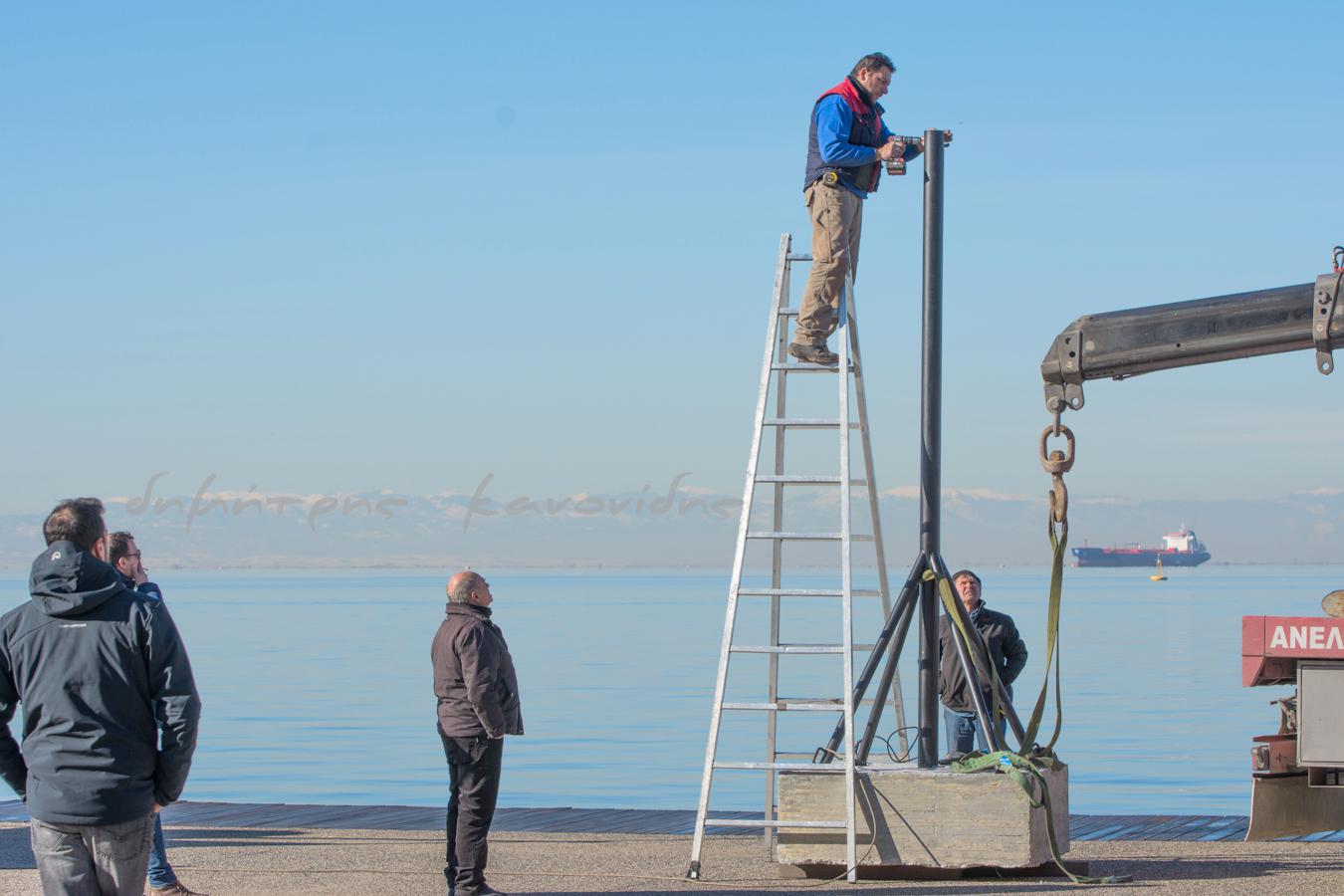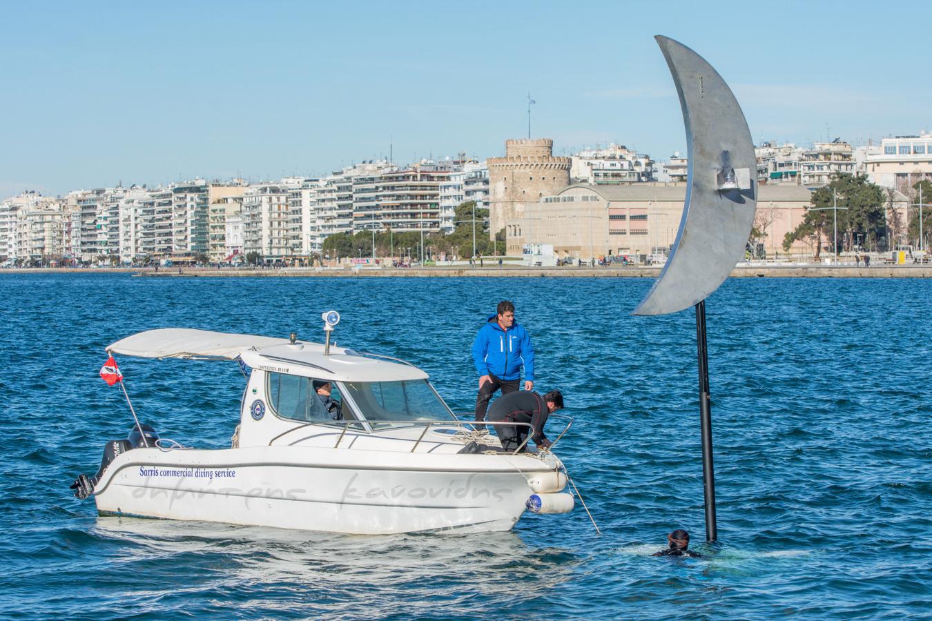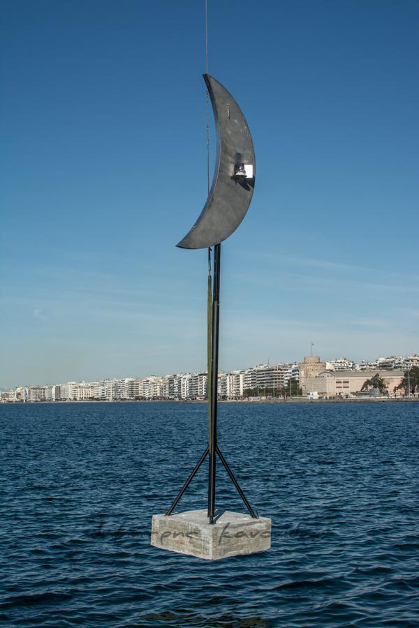 Σήμερα το πρωί ξεκίνησαν στη Νέα Παραλία οι διαδικασίες για την επανατοποθέτηση του «Φεγγαριού» του Παύλου Βασιλειάδη μέσα στη θάλασσα, ανάμεσα στην παλιά του θέση και τις ομπρέλες του Ζογγολόπουλου.