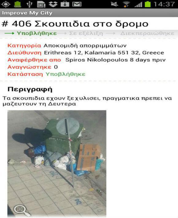 Από τις 9 Ιουνίου 2015 οι δημότες του Δήμου Θεσσαλονίκης έχουν πια τη δυνατότητα να επικοινωνούν διαδικτυακά με τη δημοτική τους αρχή ώστε να αναφέρουν, να παρακολουθούν και να επιλύουν τα καθημερινά τους προβλήματα (π.χ., πεταμένα σκουπίδια, καμένες λάμπες ηλεκτροφωτισμού, σπασμένα πλακάκια στα πεζοδρόμια, παράνομες διαφημιστικές πινακίδες, παράνομα παρκαρισμένα οχήματα, κλπ). Με αυτό τον τρόπο οι δημότες μπορούν εύκολα και αποτελεσματικά να κοινοποιούν τα προβλήματα, που βρίσκονται στη δικαιοδοσία του Δήμου Θεσσαλονίκης, αντικαθιστώντας έτσι τη συνήθως χρονοβόρα και μη αποτελεσματική τηλεφωνική επικοινωνία.