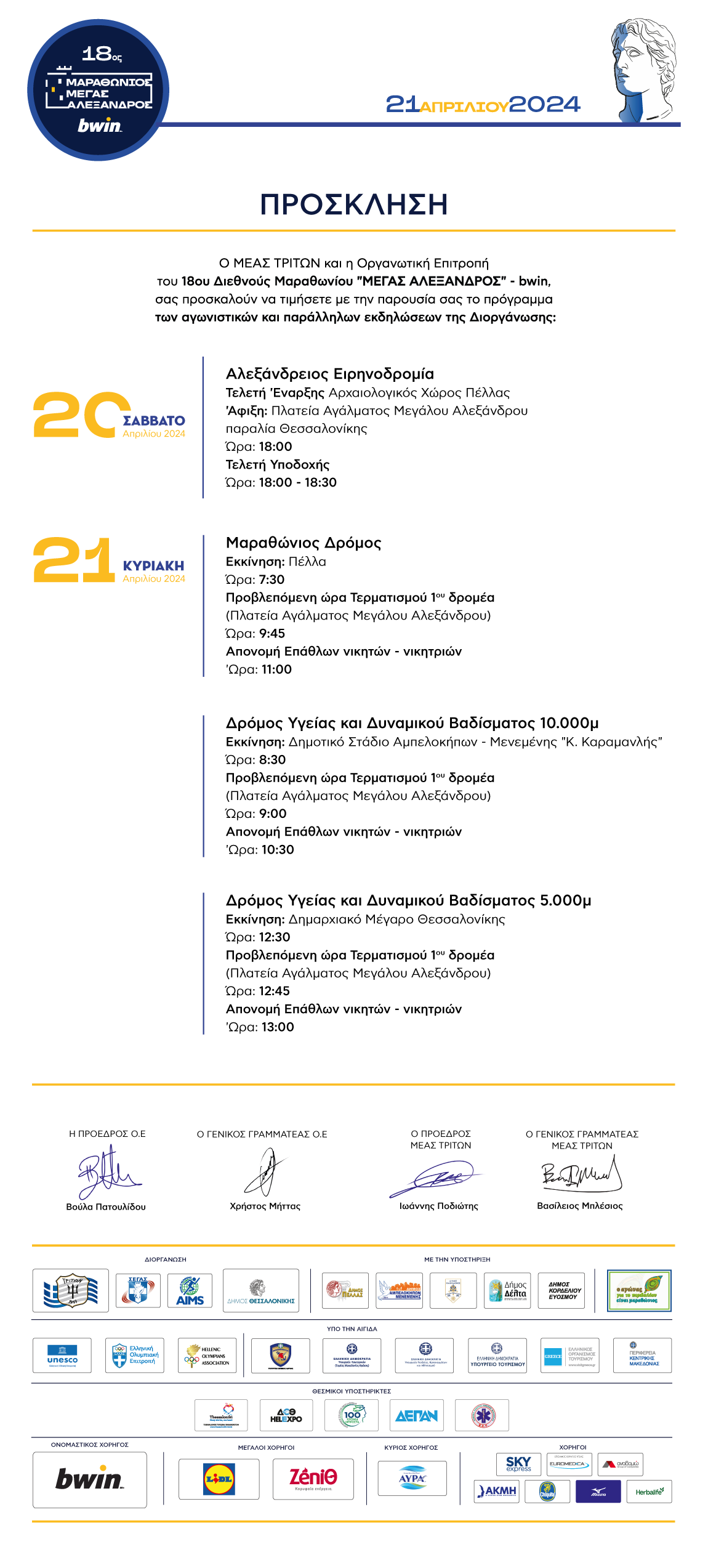Η μεγάλη γιορτή θα κορυφωθεί αύριο, Κυριακή (21/04), με το αγωνιστικό πρόγραμμα του 18ου Διεθνούς Μαραθωνίου ΜΕΓΑΣ ΑΛΕΞΑΝΔΡΟΣ – bwin να περιλαμβάνει τον Μαραθώνιο δρόμο (ώρα έναρξης: 07:30, αφετηρία: Πέλλα), καθώς επίσης τον Δρόμο Υγείας 10.000μ. (ώρα έναρξης 08:30, αφετηρία: Δημοτικό Στάδιο Αμπελοκήπων) και τον Δρόμο Υγείας 5.000μ. (ώρα έναρξης: 12:30, αφετηρία: Δημαρχιακό Μέγαρο Θεσσαλονίκης).