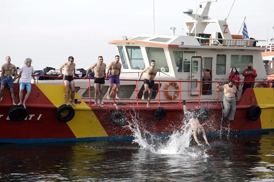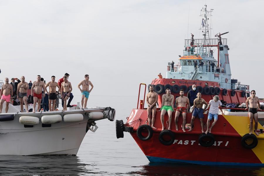 Αργότερα, 20 τολμηροί- έχοντας επιδείξει πιστοποιητικό εμβολιασμού, νόσησης ή αρνητικού rapid test- βούτηξαν στον Θερμαϊκό προκειμένου να πιάσουν τον Τίμιο Σταυρό.