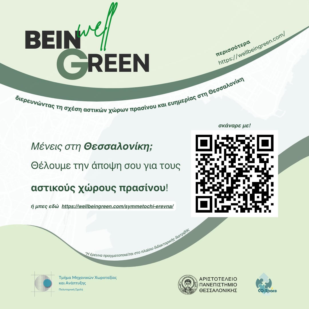 Μια νέα έρευνα ερωτηματολογίου βρίσκεται σε εξέλιξη και διερευνά τη σχέση μεταξύ αστικών χώρων πρασίνου και ατομικής ευημερίας στο Πολεοδομικό Συγκρότημα Θεσσαλονίκης. Το ερευνητικό έργο διδακτορικής διατριβής που φέρει τον τίτλο Well BeinGreen, εκπονείται από την Έλλη Παπαστεργίου, Υπ. Διδακτόρισσα του τμήματος Μηχανικών Χωροταξίας και Ανάπτυξης του Αριστοτελείου Πανεπιστημίου Θεσσαλονίκης.