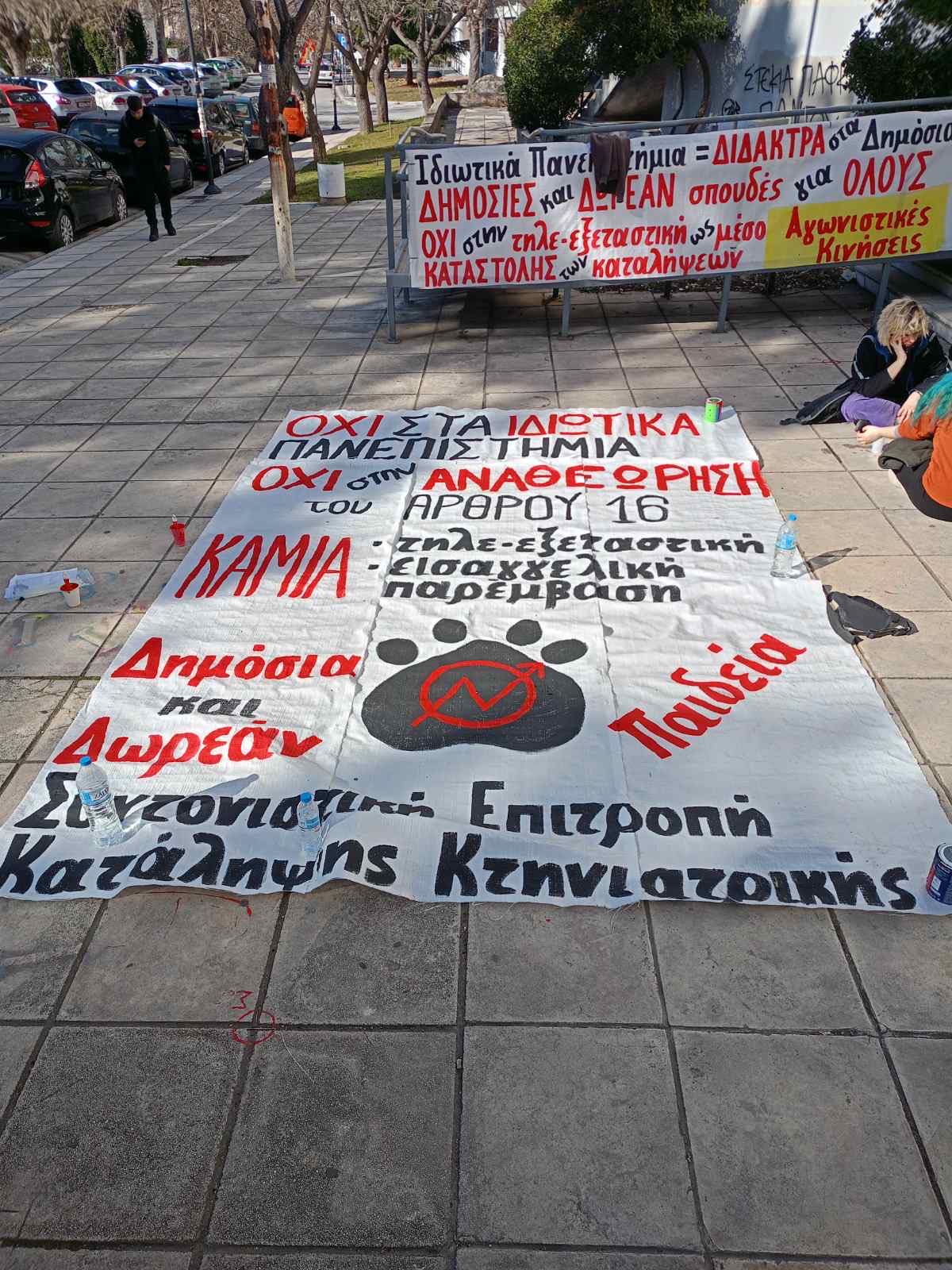 Η ώρα πήγε δέκα και μισή το βράδυ. Βγαίνουμε από το «καμαράκι» και η Μυρτώ με την Αφροδίτη μου δείχνουν τα πανό που έχουν κρεμάσει. Στο ισόγειο, γύρω από δυο τραπέζια είναι μαζεμένοι ακόμα φοιτητές που μιλούν μεταξύ τους. Μερικοί από αυτούς σε λίγες ώρες θα επιβιβαστούν για το πανεκπαιδευτικό συλλαλητήριο στην Αθήνα. Αφού χαιρετάω τα παιδιά, περνάω μπροστά από το Γεωλογικό και τη Σχολή Θετικών Επιστημών, που βρίσκονται επίσης υπό κατάληψη. Οι είσοδοι των κτιρίων είναι καλυμμένες με πανό, ενώ κάποιοι φοιτητές κάθονται στα σκαλιά και σε καρέκλες. Θυμάμαι απευθείας τα λόγια της Μυρτώς.. «Το Πανεπιστήμιο είναι ένας χώρος ζωντανός. Πάντα ήταν και θα έπρεπε να είναι».