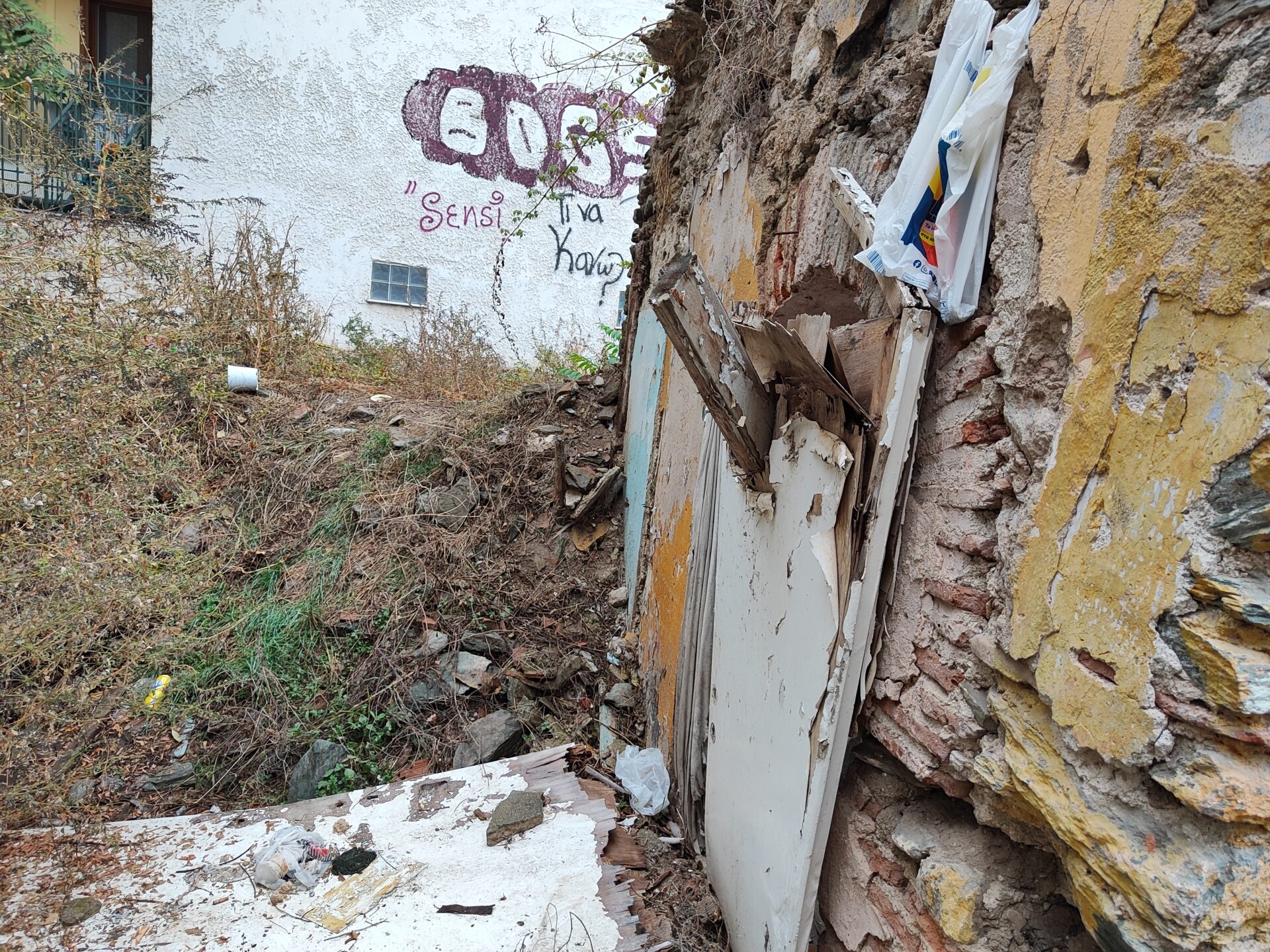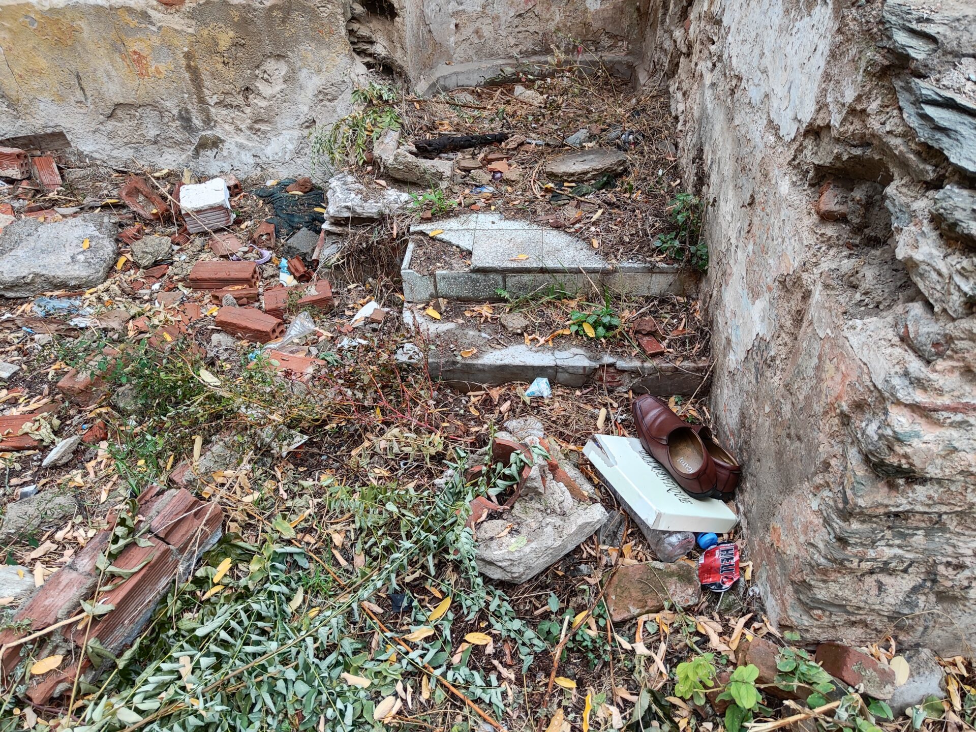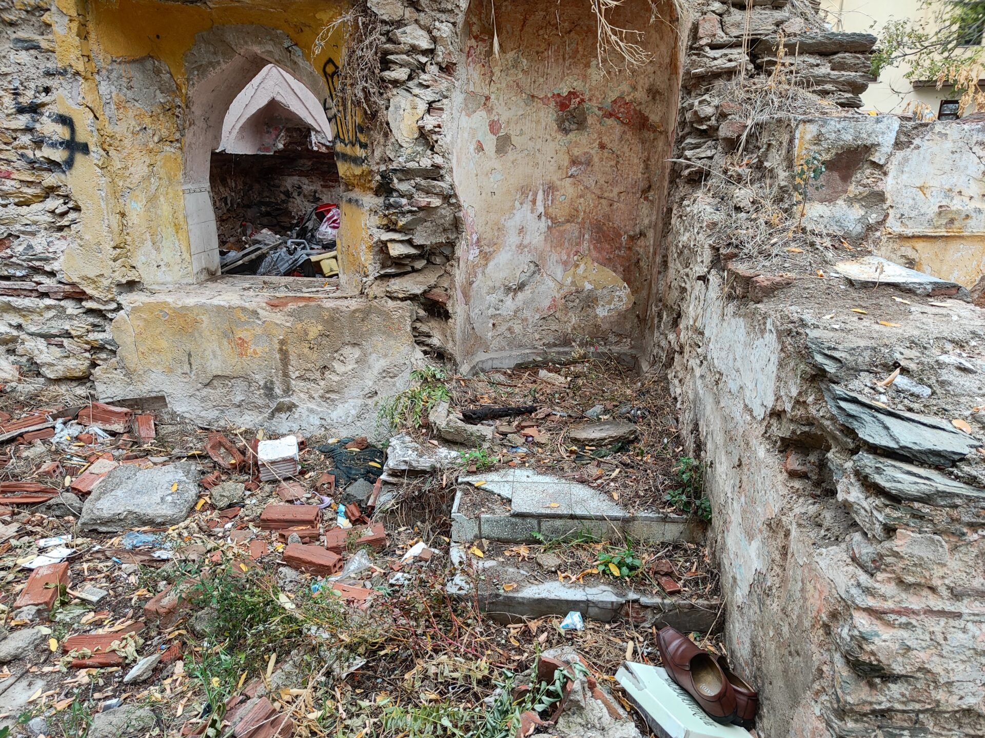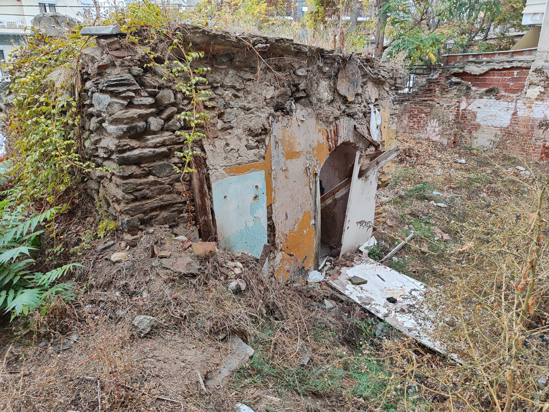 Το λουτρό βρίσκεται στην αυλή ερειπωμένης κατοικίας.
