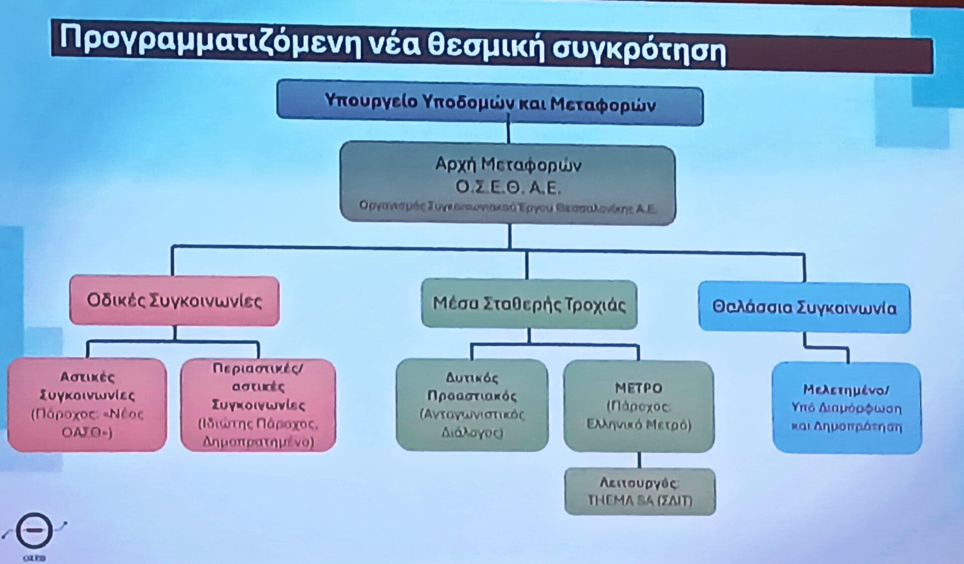 Όπως ανέφερε ο πρόεδρος του ΟΑΣΘ Κ. Ταγγίρης αναμένεται νομοθετική πρωτοβουλία της κυβέρνησης προκειμένου ο νέος οργανισμός να ανταποκρίνεται στα νέα συγκοινωνιακά δεδομένα της πόλης. Στις δύο καρτέλες που προηγούνται, αποτυπώνεται πως θα διαρθρωθεί η θεσμική συγκρότηση των συγκοινωνιών της πόλης.