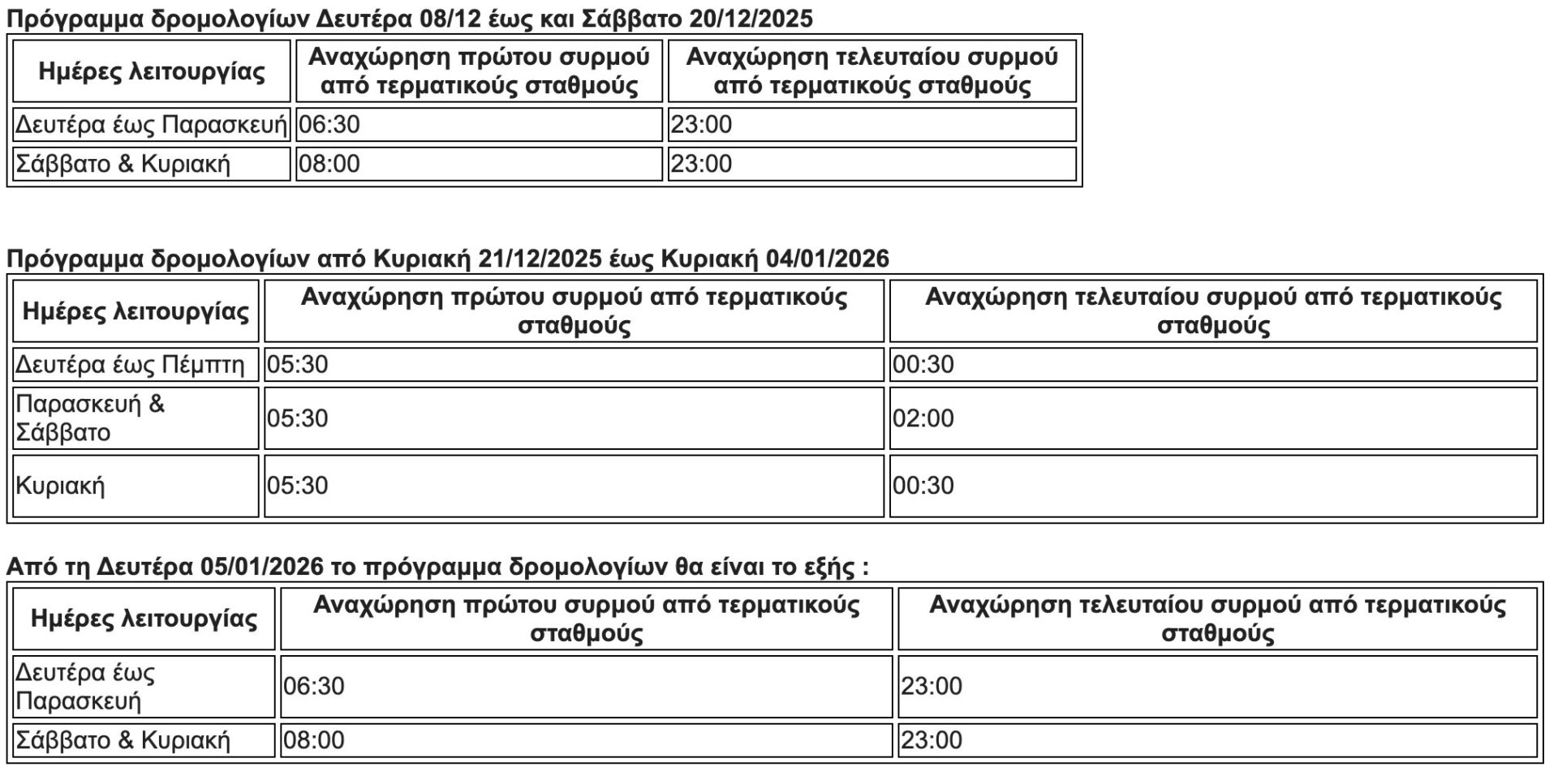 Παρότι οι δοκιμές θα συνεχιστούν και μετά την επαναλειτουργία της βασικής γραμμής, αποφασίστηκε η λειτουργία του μετρό να πραγματοποιείται με πλήρες ωράριο κατά την εορταστική περίοδο, εξασφαλίζοντας καλύτερη εξυπηρέτηση για το επιβατικό κοινό και ομαλή μετακίνηση στην πόλη.