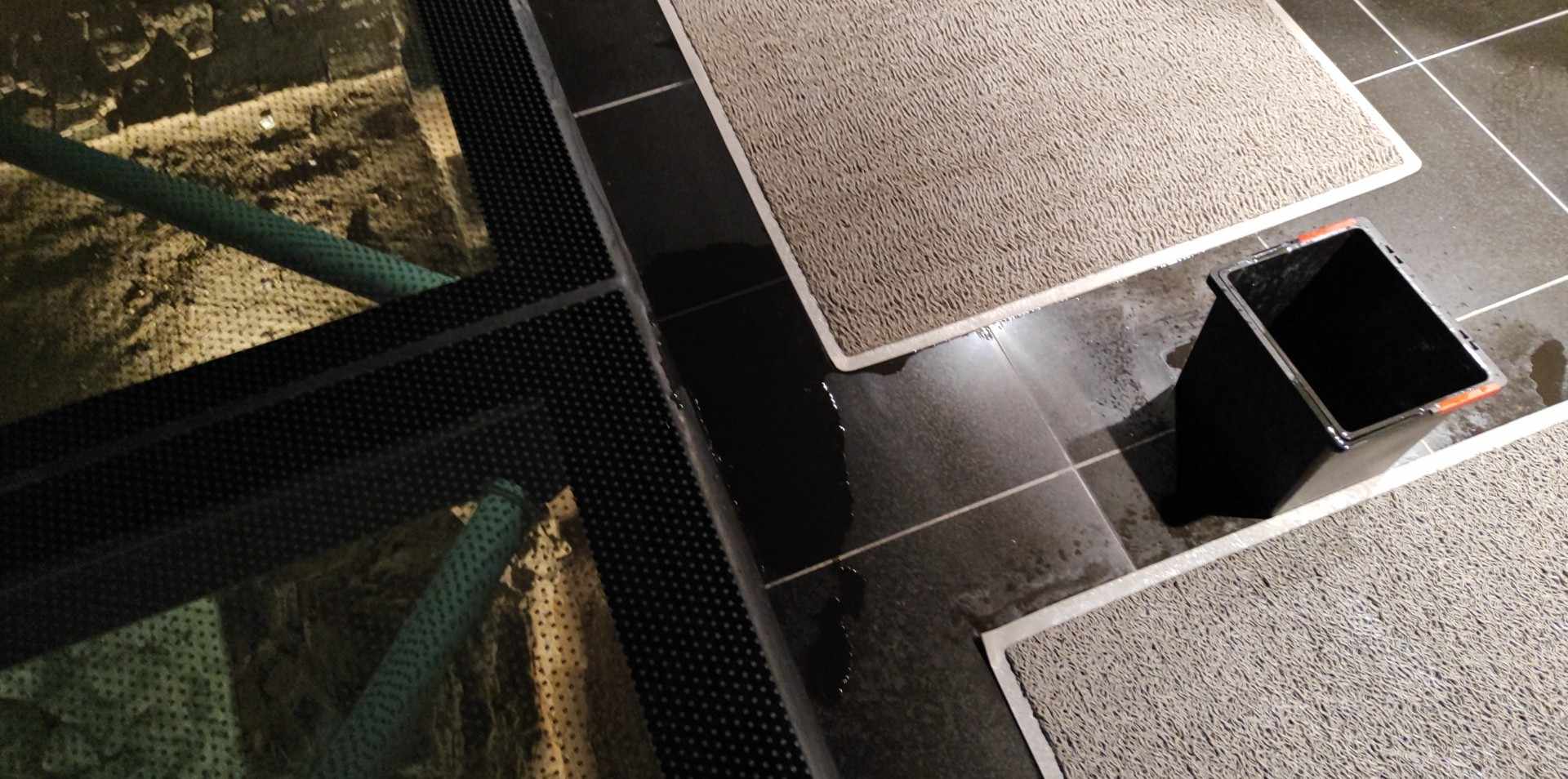 Ανάμεσα στον κουβά έχουν τοποθετηθεί και δύο μεγάλα πατάκια, ωστόσο νερά υπάρχουν και γύρω από αυτά τα σημεία, με πολλούς πολίτες που βρίσκονται σήμερα εκεί για να συμμετάσχουν στις ξεναγήσεις, να πρέπει να είναι ιδιαίτερα προσεκτικοί για να μη γλιστρήσουν.