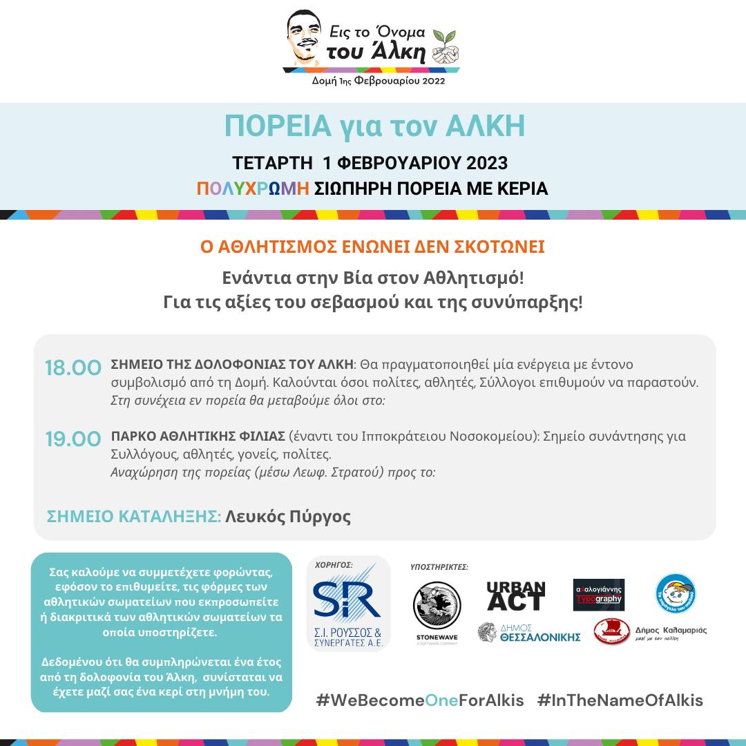 “Η πορεία θα ξεκινήσει από το σημείο της δολοφονίας στην Χαριλάου στις 18:00, με κάποια δρώμενα τα οποία θα γίνουν για να τιμήσουμε την μνήμη του Άλκη. Στις 19:00 θα ενωθούμε στο Πάρκο Φιλίας, με ερασιτεχνικές αθλητικές ομάδες και συλλόγους από όλη την πόλη, οι οποίες θα φορούν τις φόρμες των ομάδων τους, και θα κατεβούμε σιωπηλά, φορώντας τις φανέλες των ομάδων που υποστηρίζουμε, πολύχρωμα, κρατώντας κεριά μέχρι τον Λευκό Πύργο έτσι ώστε να στείλουμε με την εκκωφαντική σιωπή μας ένα ηχηρό μήνυμα συνύπαρξης και σεβασμού ότι ο αθλητισμός ενώνει και δεν σκοτώνει. Eκεί οι ομάδες του ΠΑΟΚ και του ΆΡΗ Κ18 που ταξίδεψαν μαζί στην Αθήνα θα σχηματίσουν στο πάτωμα με κεριά το όνομα του Άλκη, ενώ θα πραγματοποιηθούν κι εκεί δρώμενα, με την προβολή των δράσεων της δομής, έτσι ώστε να στείλουμε με την εκκωφαντική σιωπή μας ένα ηχηρό μήνυμα συνύπαρξης και σεβασμού ότι ο αθλητισμός ενώνει και δεν σκοτώνει. Πίσω από αυτή την μεγάλη δράση τρέχει και μία καμπάνια #webecomeoneforalkis στα social media, όπου καλούμε φιλάθλους και οπαδούς όλων των ομάδων να φορέσουν τις φανέλες τους και να φωτογραφηθούν με τους αντιπάλους τους. Η πολυχρωμία πρέπει να γίνει η καθημερινότητα μας.”