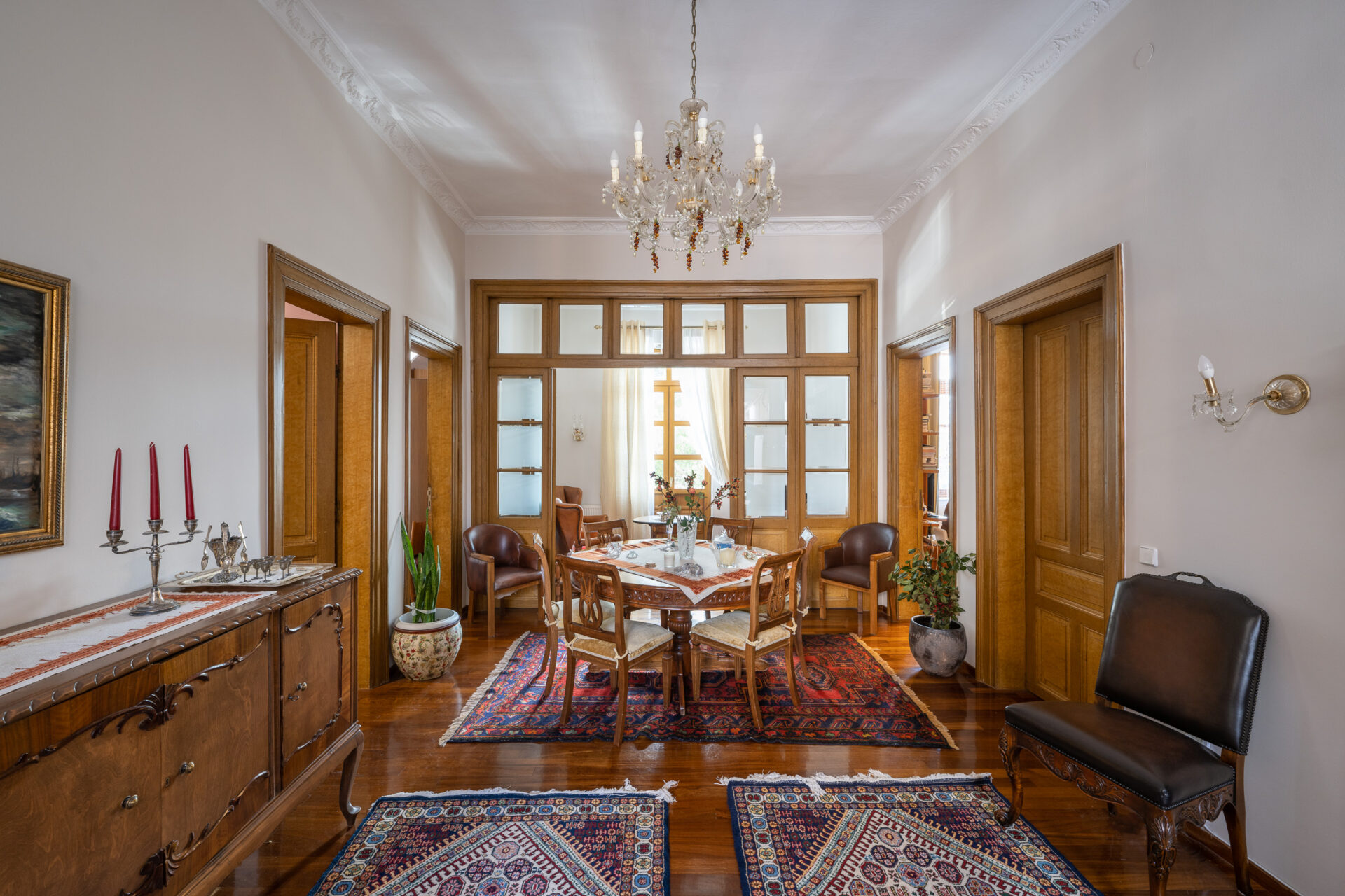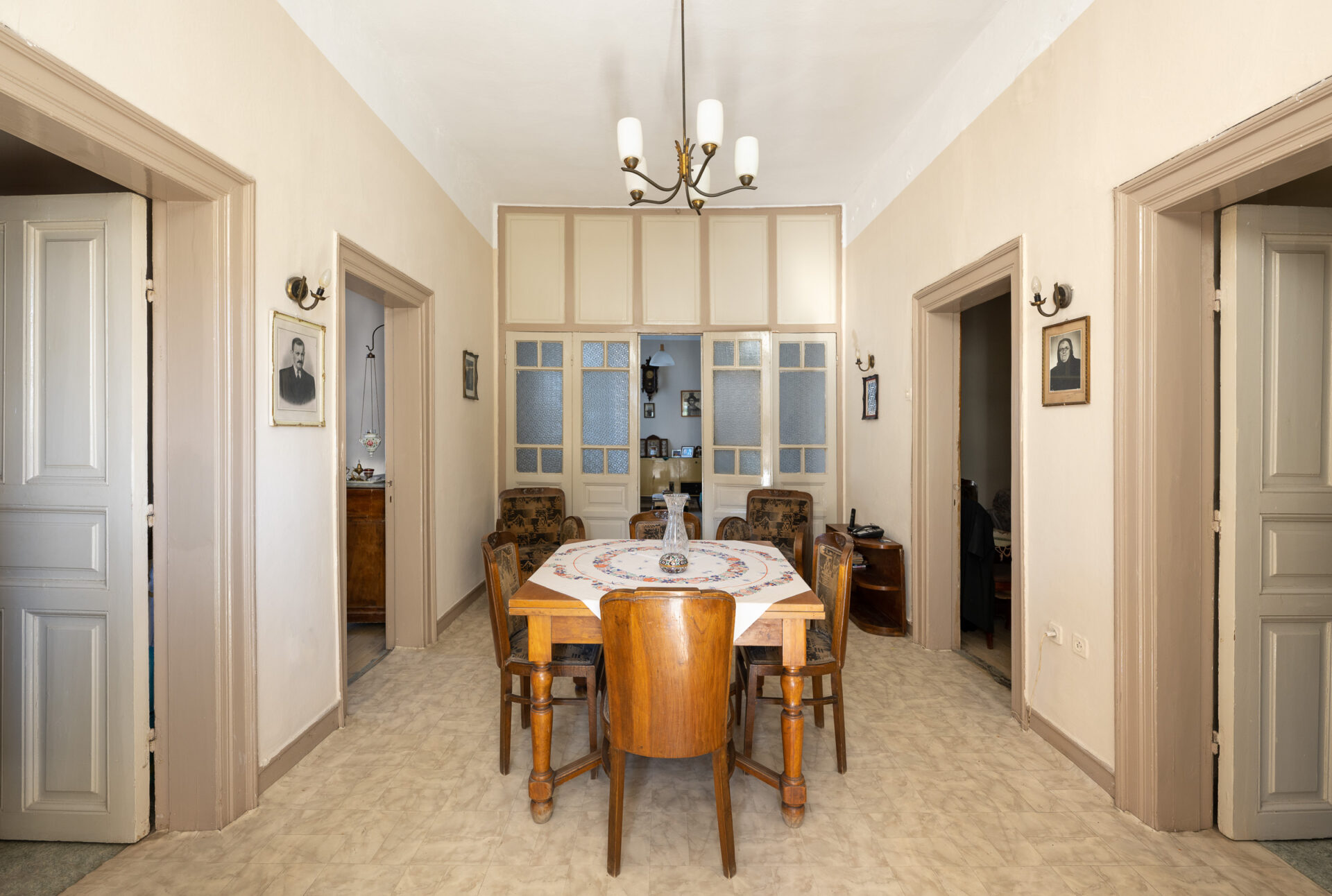 Τα δωμάτια είναι συνήθως δύο σε κάθε πλευρά. Κατά κανόνα, οι κύριοι «καλοί» χώροι διατάσσονται στην επίσημη όψη, ενώ οι βοηθητικοί (κουζίνα, αποχωρητήριο), που άλλοτε αποτελούσαν χωριστά κτίσματα στην αυλή, ενσωματώνονται τώρα στην κάτοψη και χωροθετούνται στην πίσω πλευρά, προς τον ακάλυπτο.