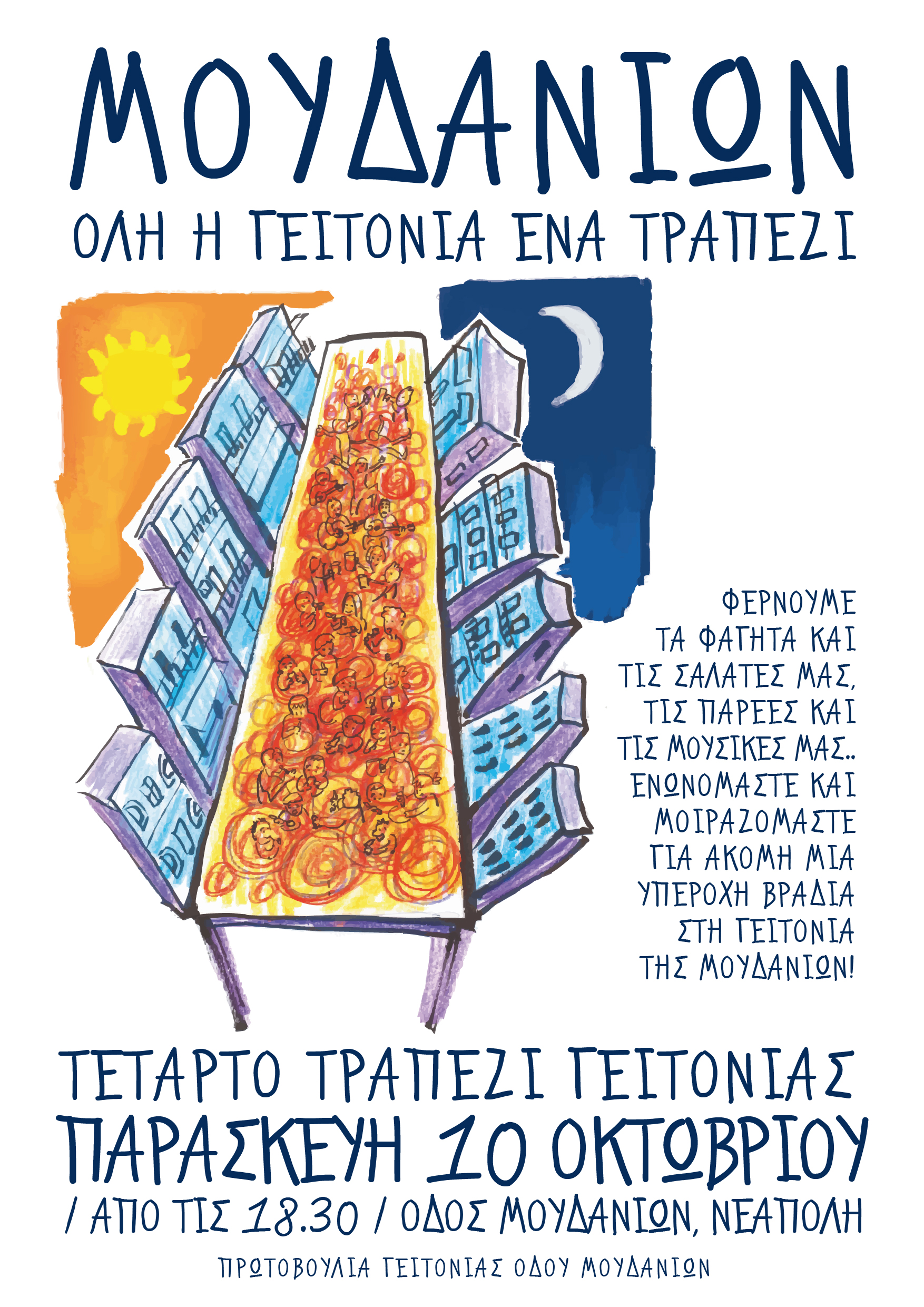 Το απόγευμα της Παρασκευής 10 Οκτωβρίου, φέρτε λίγο φαγητό, πολλή διάθεση και αστείρευτη όρεξη για γλέντι, κουβέντα και ελάτε να γιορτάσουμε όλοι μαζί στη γειτονιά Μουδανίων της Νεάπολης ξορκίζοντας τον ατομισμό, τη μιζέρια και την εσωστρέφεια της αστικής μοναξιάς. Και κάνα έξτρα τραπεζάκι ευπρόσδεκτο.