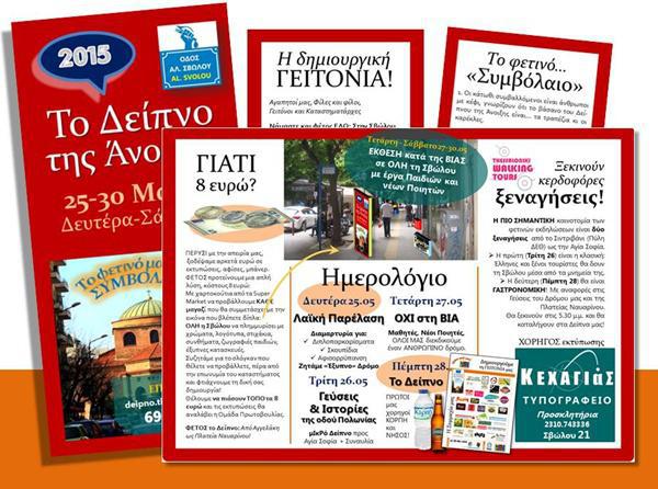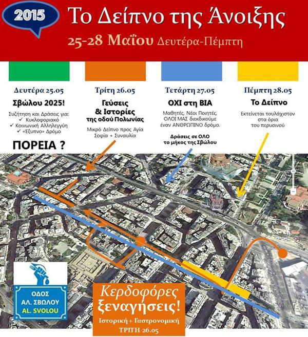 Είστε έτοιμοι για μια εορταστική εβδομάδα που φέρει την υπογραφή των κατοίκων της οδού Σβώλου και θα κάνει τη γειτονιά αυτή talk of the town; Και όταν μιλάμε για εορταστική εβδομάδα, δε μιλάμε μόνο για χορό και ξεφάντωμα, αλλά και για λαϊκή παρέλαση με πολλά μηνύματα και αμέτρητους συμμετέχοντες, ιστορικές και γαστρονομικές ξεναγήσεις, δείπνα -σε αυτά υπάρχει ένας αστερίσκος, στον οποίο θ’ αναφερθούμε στη συνέχεια- κι έκθεση ζωγραφικής με θέμα “Κατά της βίας στο σχολείο, στο πεζοδρόμιο, στην πόλη, στον κόσμο”, με δημιουργήματα των μικρών μας φίλων που μένουν στη Σβώλου, αλλά και ποιήματα νέων που συμμετέχουν στην “Ποίηση Γυμνή”.